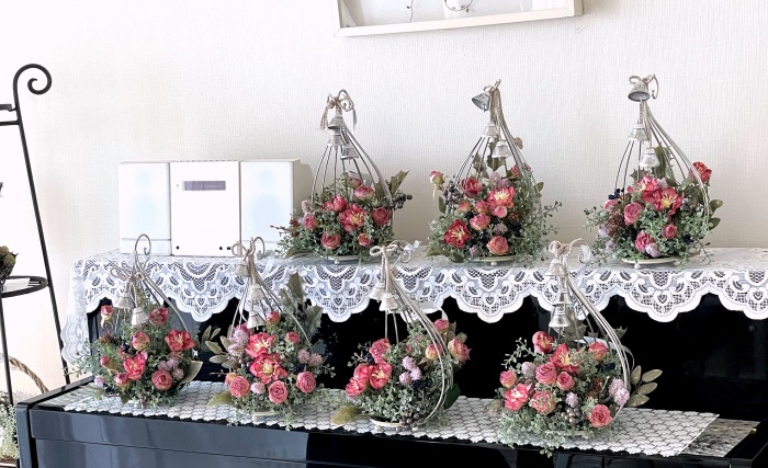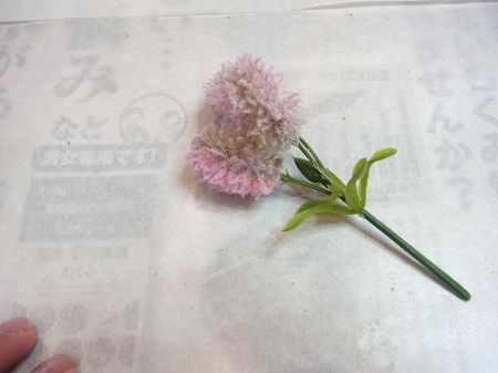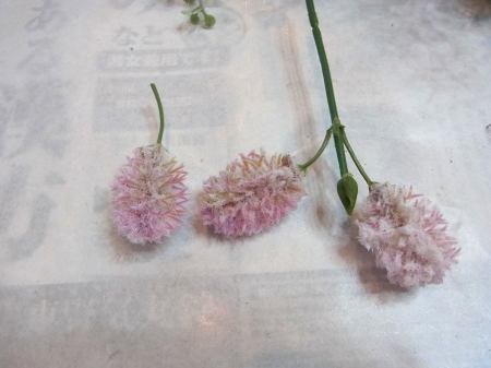| 千日紅は茎を5~6センチにカット。そのままでもよいいですし、さらに小分けにしヘッドだけとばしても可愛いですね。 | |