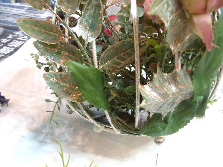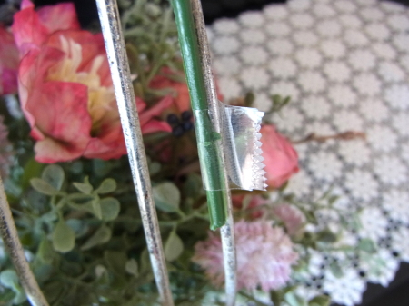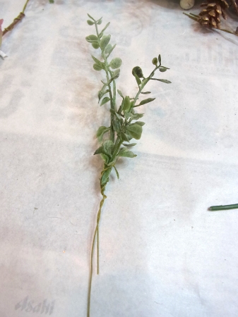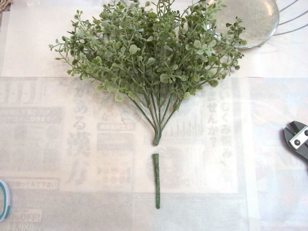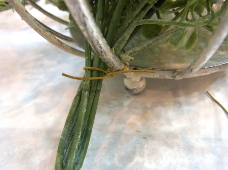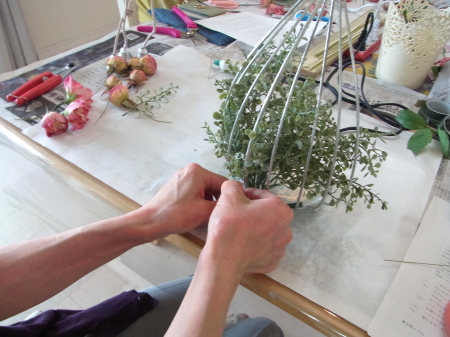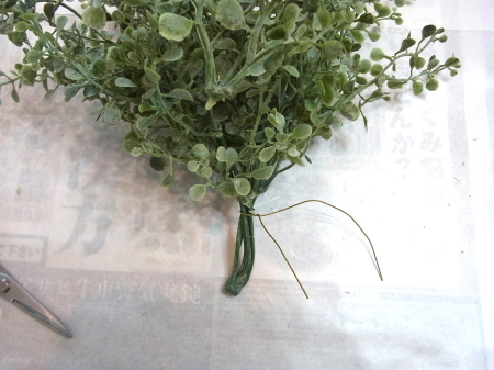 | 葉が広がる分かれ目のすぐ下を1/2のワイヤーで一旦、まとめます。 こうすることで、中が密になり、足場が安定します。 |