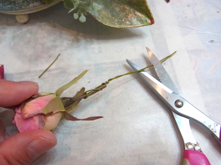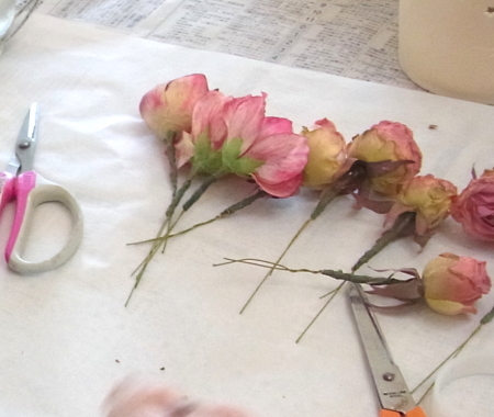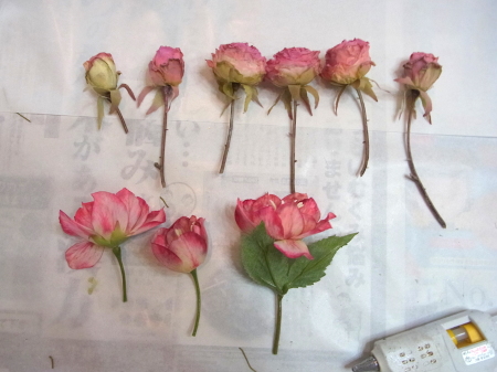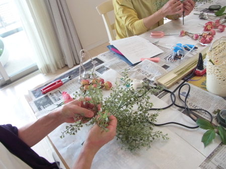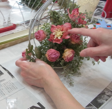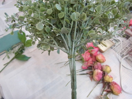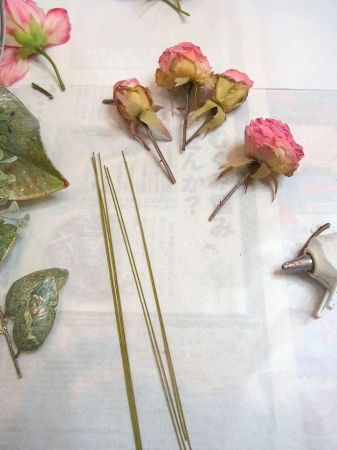 お花の準備をしましょう。 すべてを小分けにします。 バラは持ち手3センチくらいにして、棘が出ていて、痛いところがあったらすっきりカットしておきましょう。 ワイヤリングして、 上の方だけテープでかくします。 ポイント フラワーテープを巻くのはねじかけた部分だけ。 上のほうだけにしてください。フラワーテープはグルーと相性がわるく、つかないためです。ワイヤーの素地のままのほうがベターなのです。 クリスマスローズも同様に、木の実などはワイヤリングしなくても、そのままグルーでつけられますが、高さが欲しいときはワイヤリングしてください。 |