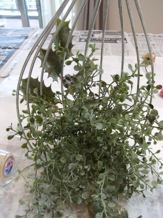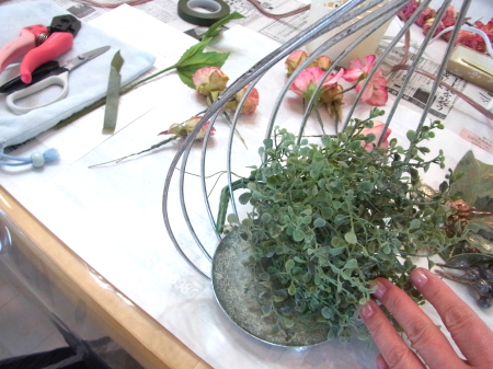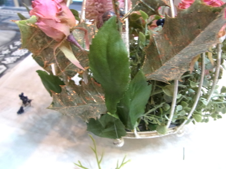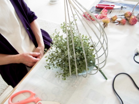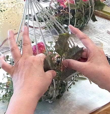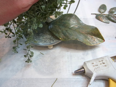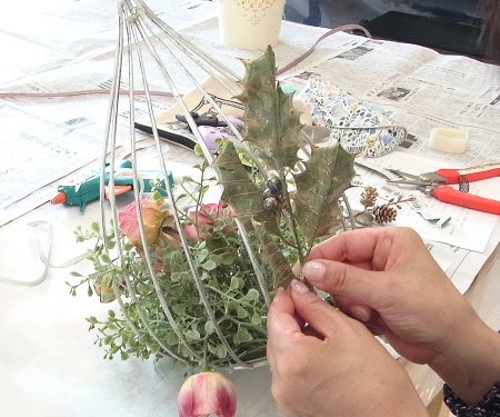 | 背景もつくりつつ、葉や実は器の中にも使います。 さらに、ここから本格的にお花たちを、グルーで固定していきます。 長いときは適宜カットします。 |