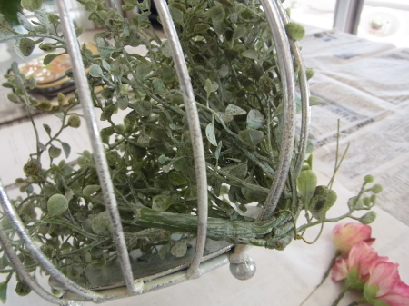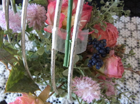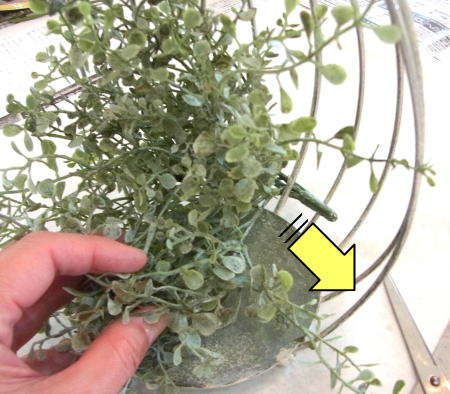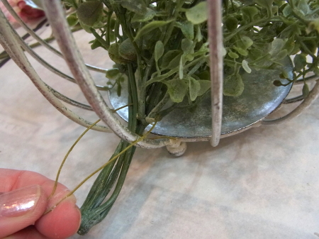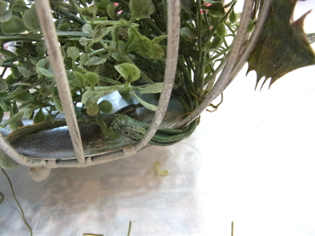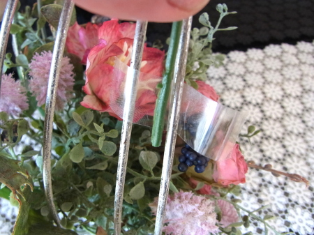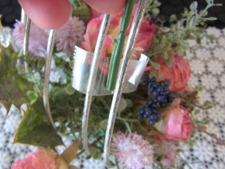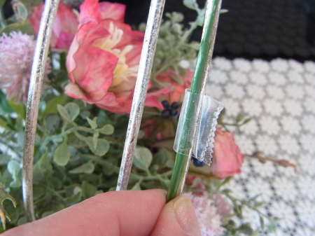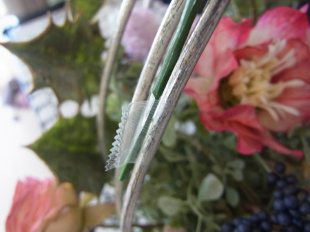 | 真ん中に挿した茎を裏から、隣の支柱にひっかけます。すると、茎のワイヤー束が抵抗するので、ユーカリが器にフィットします。 グラグラするようでしたら、さらにワイヤーで支柱に固定しましょう。 |