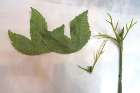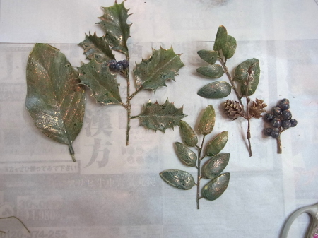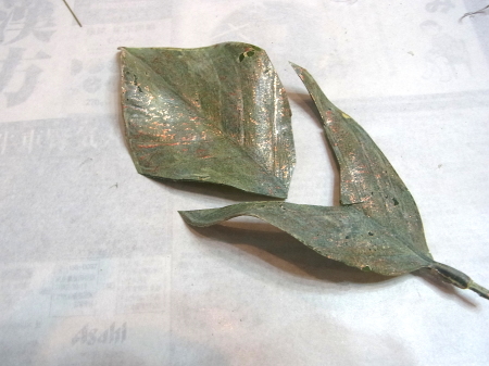 | 仕上げは葉っぱシールで隠します。 葉っぱシールの作り方 クリスマスローズの葉を葉脈からべりべりっとはがします。 ペラペラにした状態にしたほうが、フィットします。隠しやすいのです。 さらに小分けにしてあちこちにつかいましょう。 |