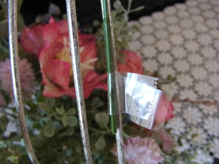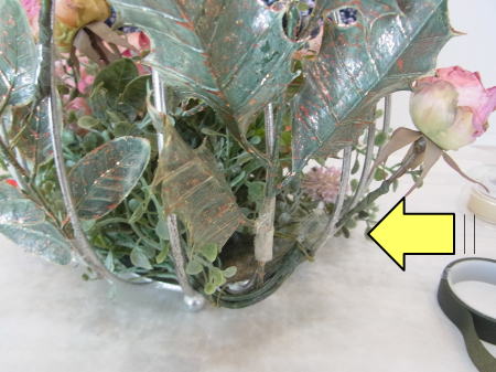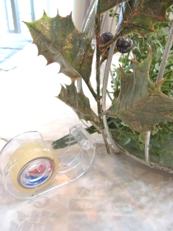 | テープでの固定方法 器の中ははグルーでベースにとめていけばよいのですが、花、シルバーリーフ、実、など、正面から見てここにあるといいなぁ~という場所もでてきますよね。そんなときは、出来るだけ目立たない場所で器にセロテープでつけましょう。 あまりぐるぐる巻く必要はありません、写真のようにサンドイッチ方式でOKです。仕上げにセロテープは葉っぱシールでかくしますので、さらに強固に接着されますのでご安心を。 |