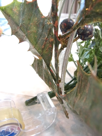 | 背の高い柊を、正面からみて、背景として使いたい場所をきめます。 写真は器の外側にしていますが、内側にグルーでとめて使ってもかまいませんし、上下で小分けにして使ってもOKです。 ポイント 器の外側に使う効果としては、全体的な広がりが表現できます。 どうしても器の中だけですと、こじんまり、詰めこんだアレンジなりがちですが、お花も、リーフも器から飛び出させたり、 器の外側に着ける、これだけで、前から見たときに、アレンジ全体がフンワリ心地よさそう空気感になります。 |