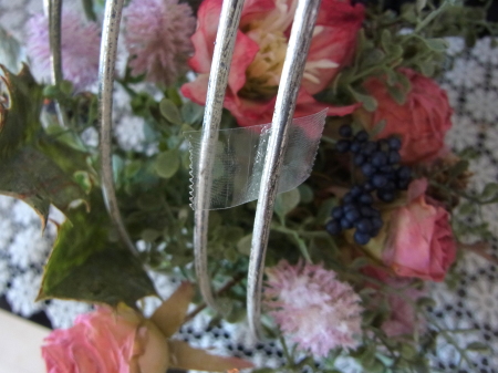 | 全体的に、かなり片側に寄りますので、そこから一本づつ、根元から、丁寧に中央にもどします。 放射状に広がるベースをつくります。 |