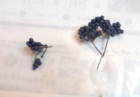 | 実を小分けにして散らします。ちょっとの量ですが、この濃紺の実の有無がデザインに大きく影響します。 デザイン全体を引き締めてくれます。 注意 小分けにするときに、発泡スチロールの白いところが見えてしまったら、マジックで塗っておきましょう(^^♪ |
