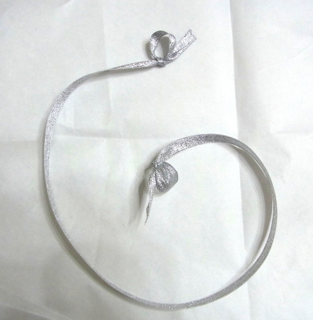 | 壁に吊るす方法です。リボンの両端に親指が通るくらいの輪をつくります。 | |