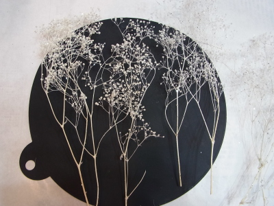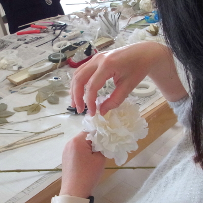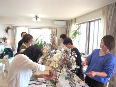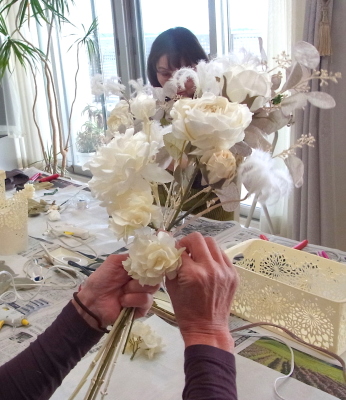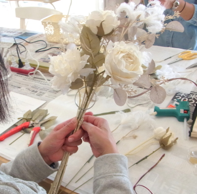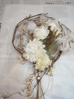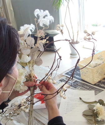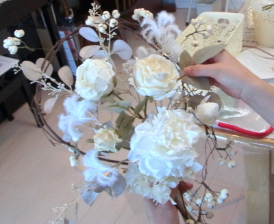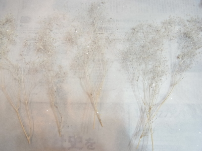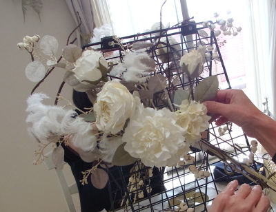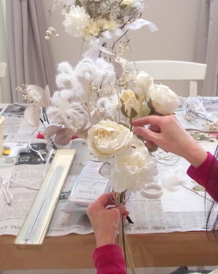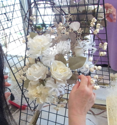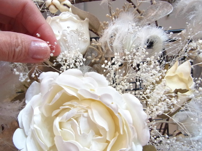 | カスミソウをこわけにして、グルーでとめます。下からさしたり、つるに留めたり、お好みの位置にいれて完成です。 ポイント 後ろのほうは、長い茎のまま入れてもOKですが、前面は、短めにカットして、斜めにしていれるとぐんと立体感がつくれます。 |