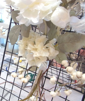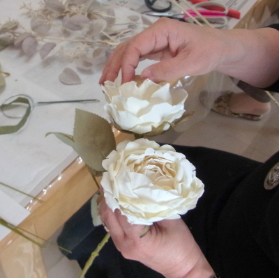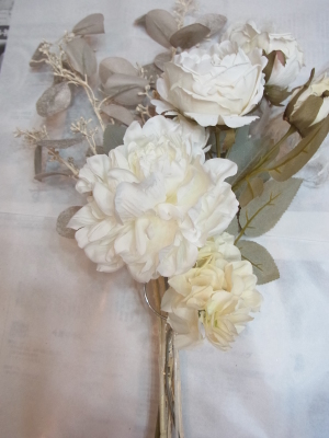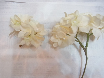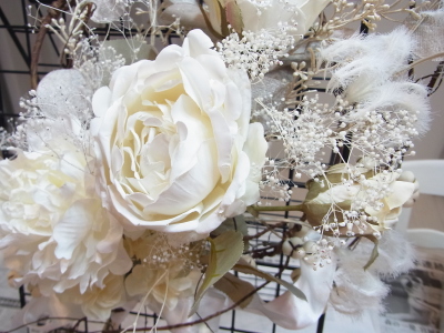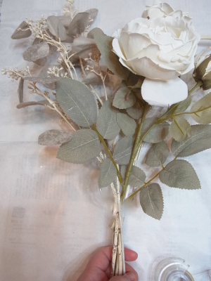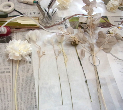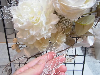 | ざっくり持って雰囲気をつかみます お花を小分けにしましょう バラとピオニーのつぼみを分かれ目で切り離します。 クレマチスシードを下から二枝分かれ目でカットします それぞれ太いワイヤー1/2で添木、テーピングします。(すべてのテーピングは緑でも白でももOKです) 茎の切り口までを巻き、下まで巻く必要はありません。固定するのに、必要な分量だけでOKです ★お好みで大輪のバラも小分けにしてOKです。 バラの葉は下から二枚カットしておきます。 後で使います。 バラの棘はカットしておきます。お花を上下させるときスムーズになります。 紫陽花はひとつだけ外しておきます。はずしたものはさらに小分けにしておきます。 |