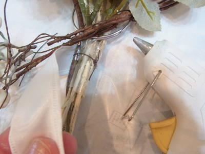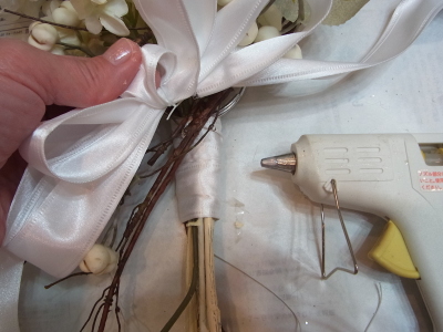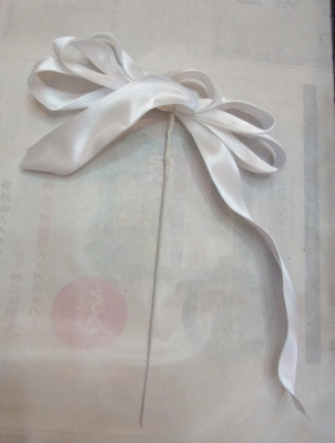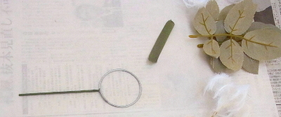 | リボンを15センチくらいカットし、セロテープ、ワイヤーをかくします。 | |
