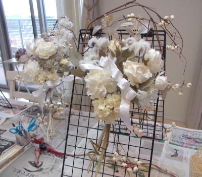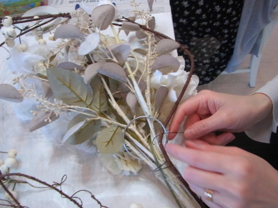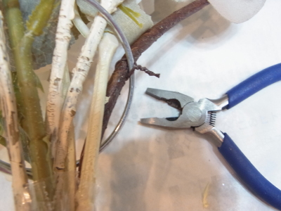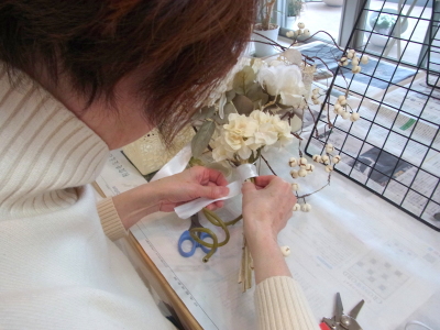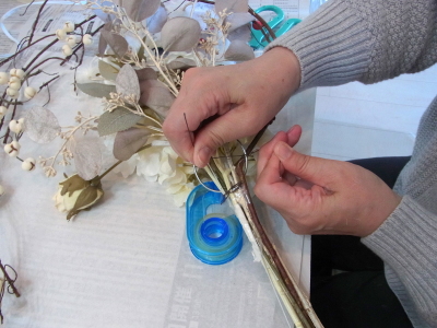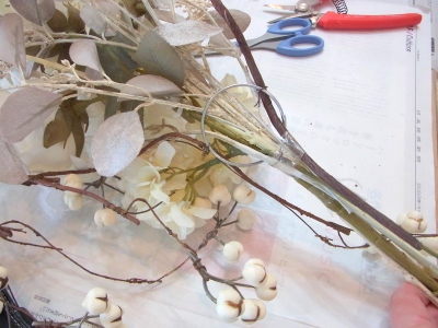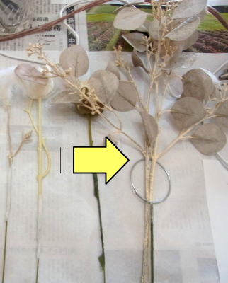 | デザインがきまったら、固定できる部分は写真のように。さらにリングの左右両サイドをつかって、ワイヤー1/2で茎を固定します。 こうすることでとても安定します。 |