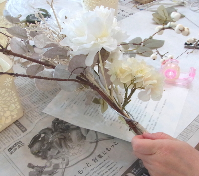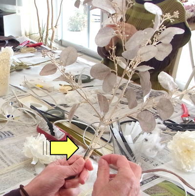 リングのすぐ下と1センチほど下げて 2か所で、しっかりセロテープでとめます。 ユーカリのトップが、アレンジの頂点になります。 |