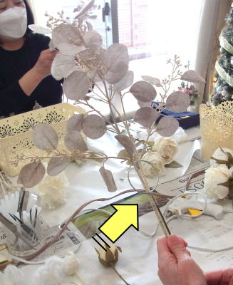 それでは アレンジしていきましょう! ユーカリを魔法のアシストリングの上から挿します。 このときユーカリの位置は写真のように、分かれ目がリングの上にくるようにします。 |