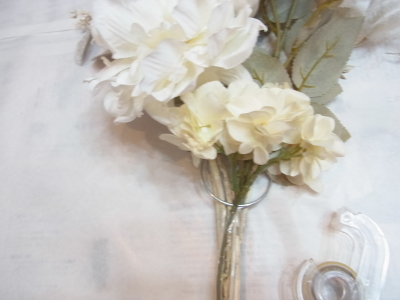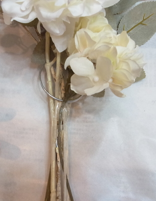 | 最後に茎の付いた紫陽花を手元にいれこみ、テープで持ち手にとめて、リングを隠します。 |