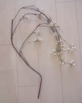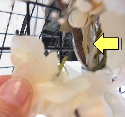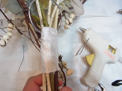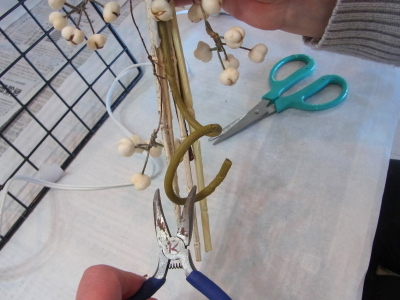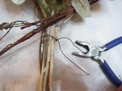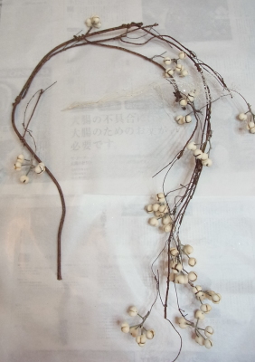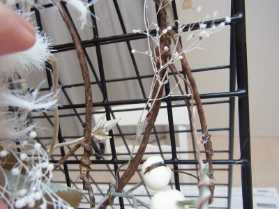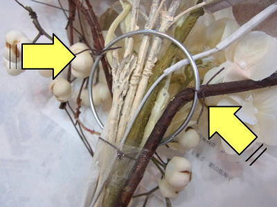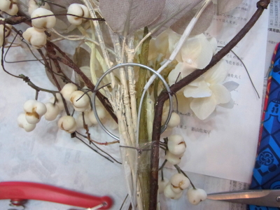 | ナンキンハゼの茎をリングの左右どちらか、脇に上からさしてテープで止めます 10センチ12~13センチ程度 | |
