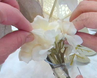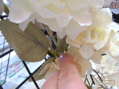 | 最初にとっておいた紫陽花をさらに小分けにして、脇からみてリングがみえていたら、その周辺の花材につけて、見えないようにしましょう。 ★コツは リングにはつけないことです。リングにつつけてしまうと、その部分はフックとしてつかえなくなってしまうので注意しましょう。 |