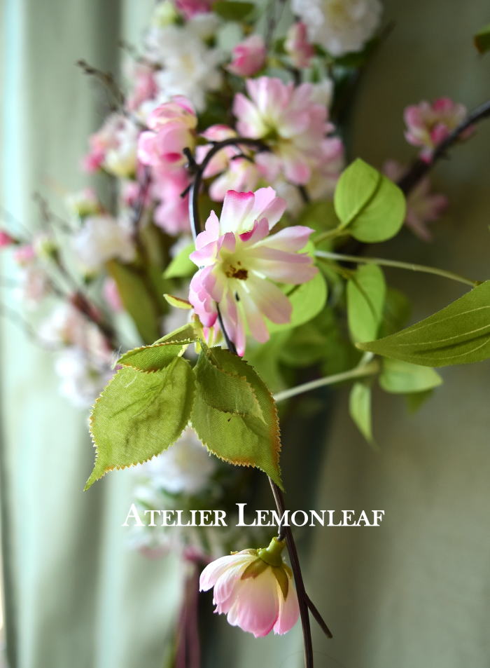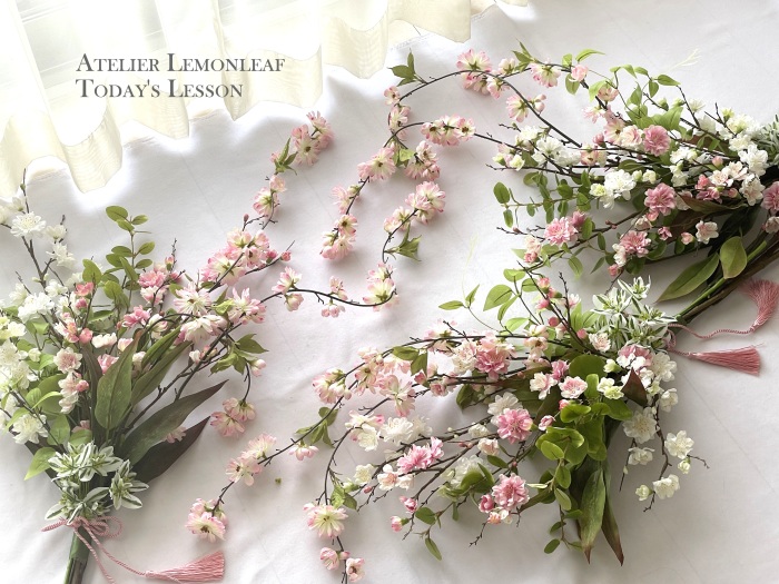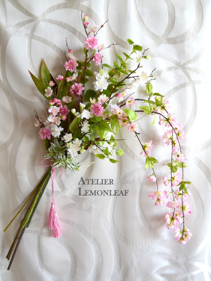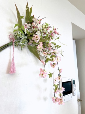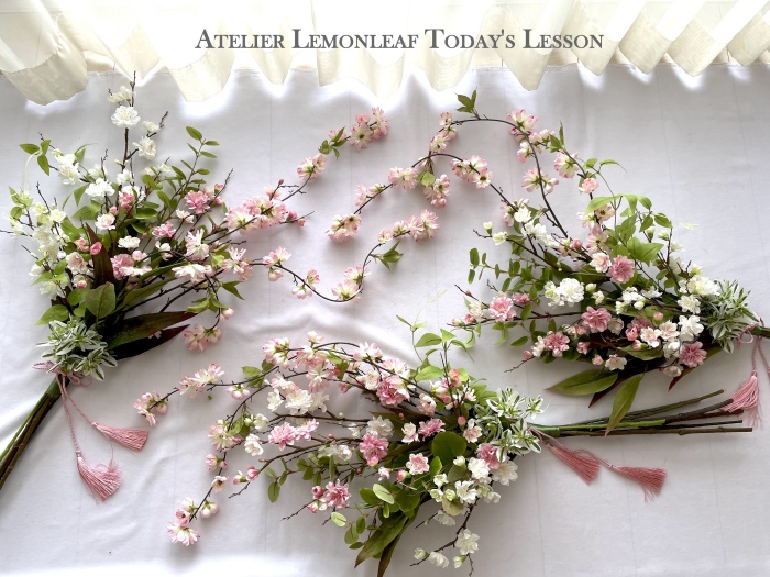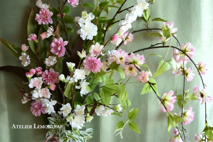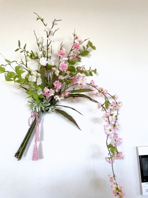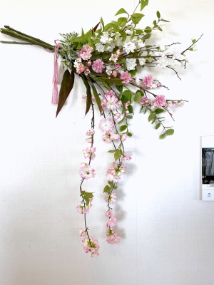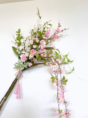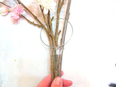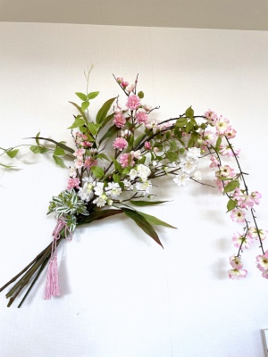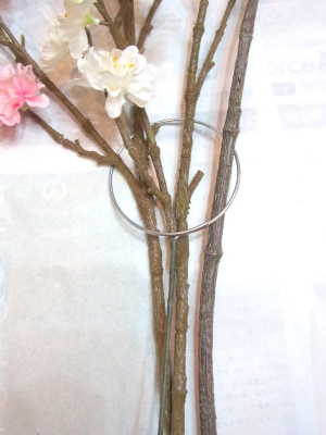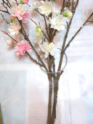 | 中心になる日本の枝桜が入ったら次にしだれ桜をリングに挿します 左左右どちらでもオッケーです 低く挿してもいいですし高くさしてもOKです 中心に入れたり、前面じ垂れ下がるようなデザインもOKですよ いろいろ場所を探してみてくださいね! |