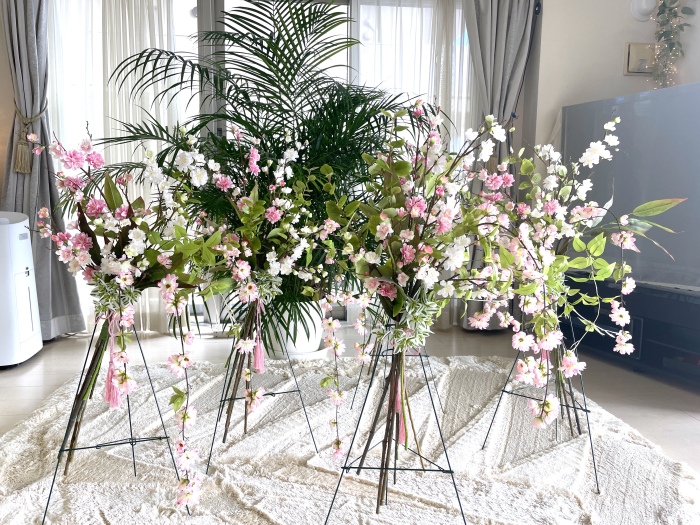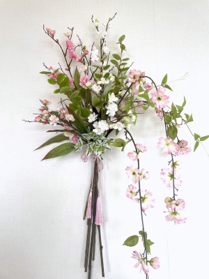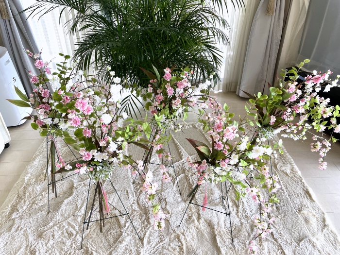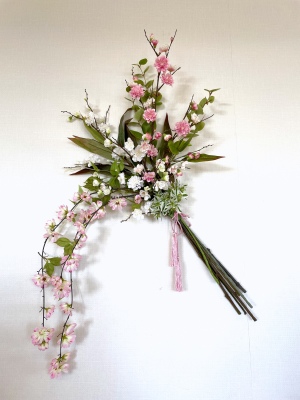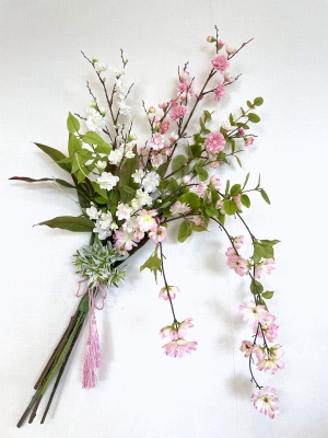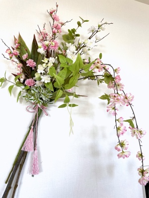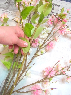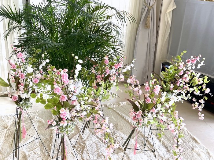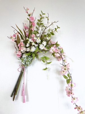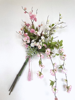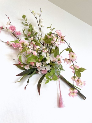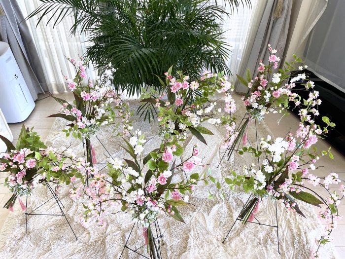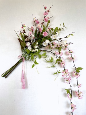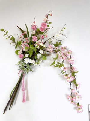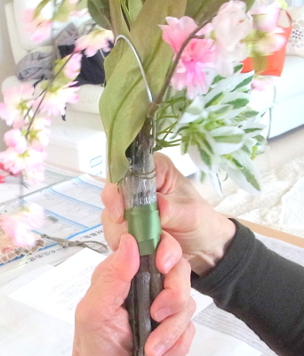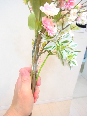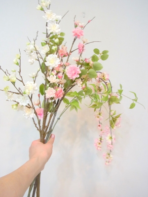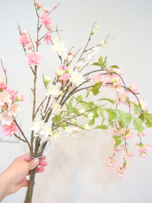 | ポイント アーティフィシャルフラワーは輸送上 全員直立しているので手に持って 一つ一つ ふんわり広げてみましょう まず最初にお花全体をざっくり持ってみましょう。これはどんなアレンジのときも、やってお区べき事。 なぜなら、雰囲気もつかめますし、量的なものも把握できます そしてどんな感じでデザインするのかもイメージしてみましょう。 飾る場所によって、枝垂れ桜の高さも変えると素敵です。 一番中心にくる日本の枝桜を魔法のアシストリングに挿します 枝桜は、ピンクと白、どちらでが左右でも構いません 位置は一番下の花が魔法のアシストリングの丸の上にくるくらいにしましょう 写真の白い花もうちょっと上に出してもよいですね |