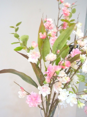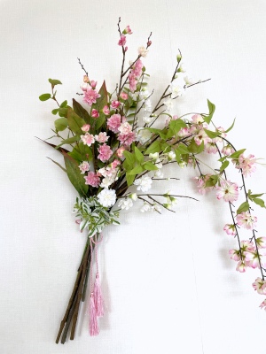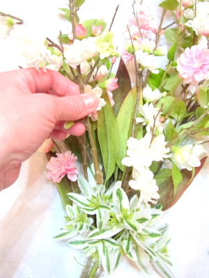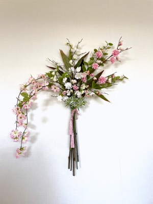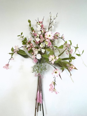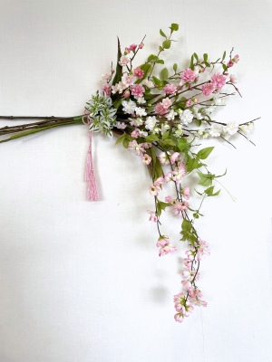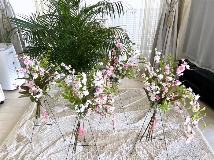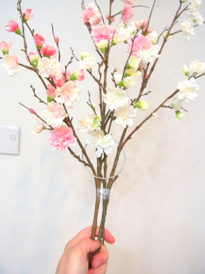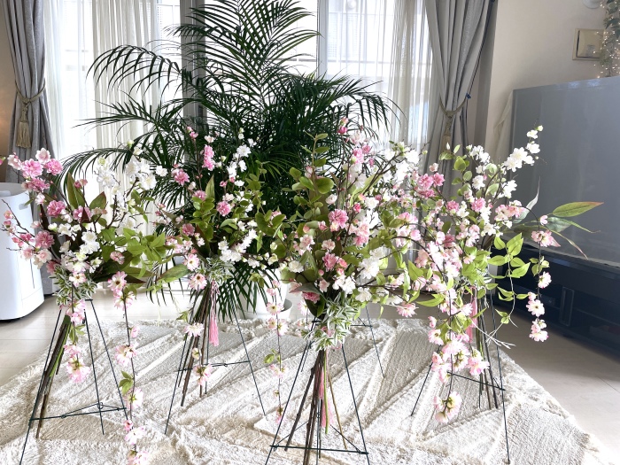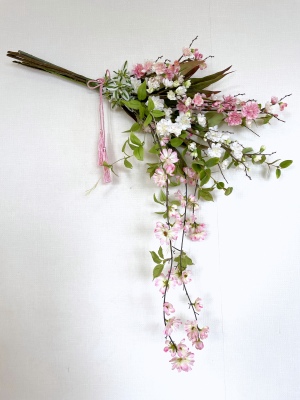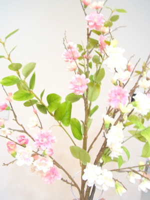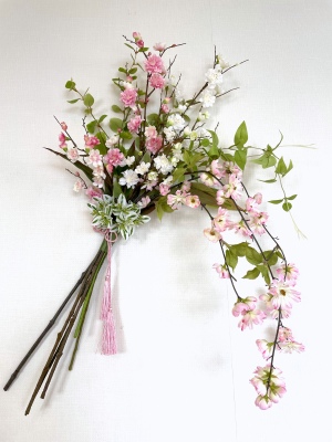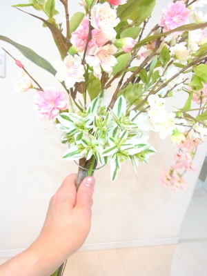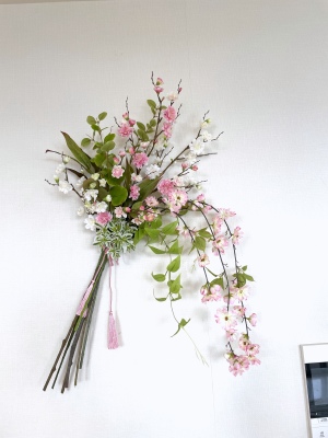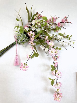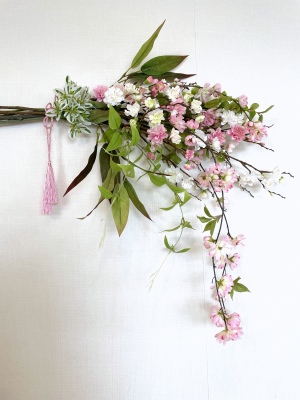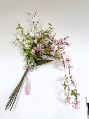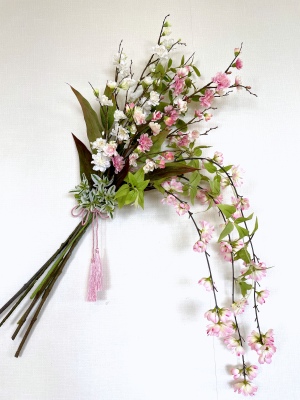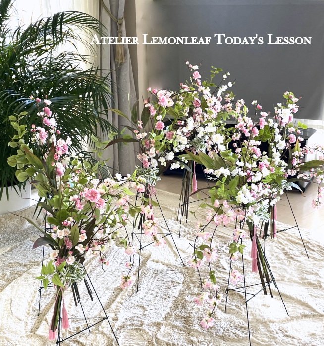 | ポイント アーティフィシャルフラワーは輸送上 全員直立しているので手に持って 一つ一つ ふんわり広げてみましょう まず最初にお花全体をざっくり持ってみましょう。これはどんなアレンジのときも、やってお区べき事。 なぜなら、雰囲気もつかめますし、量的なものも把握できます そしてどんな感じでデザインするのかもイメージしてみましょう。 飾る場所によって、枝垂れ桜の高さも変えると素敵です。 一番中心にくる日本の枝桜を魔法のアシストリングに挿します 枝桜は、ピンクと白、どちらでが左右でも構いません 位置は一番下の花が魔法のアシストリングの丸の上にくるくらいにしましょう 写真の白い花もうちょっと上に出してもよいですね |