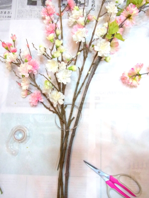 | しだれ桜の位置がきまったら、同様にテープでとめます。 | |