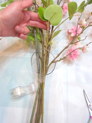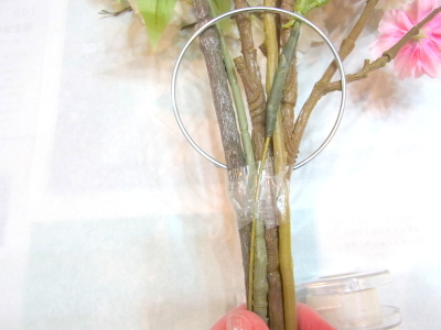 | 魔法アシストリングのもち手にテープで止めます。今回は太枝なので、二か所に留めます。 固定する場所は、 魔法のアシストリングのリングのすぐ下と、そこから5mmぐらい下がったところに、二か所テープでとめます。 これからテープをたくさん使いますがこのテープの範囲でとめていきます。 あちこちテープが飛びますと後でリボンで隠せなくなりますので、注意しましょう |