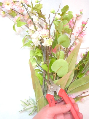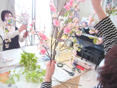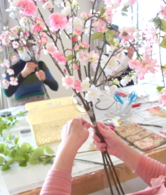 | これで花材も全部はいりました。 ここから先は、枝を変えたいというような場ときは枝を切って。グループで付けていきましょう |