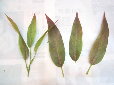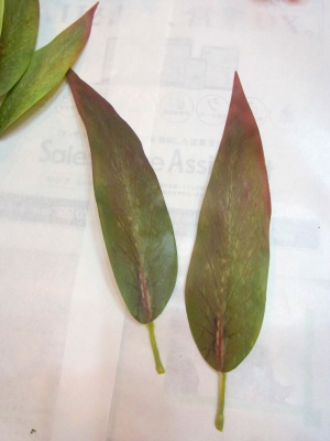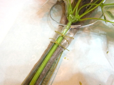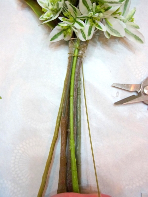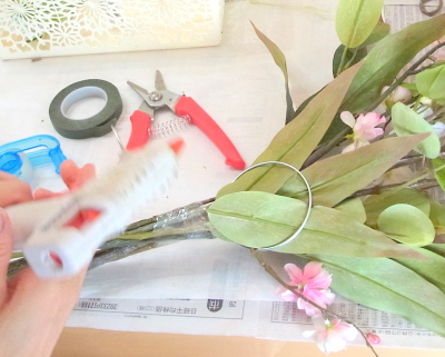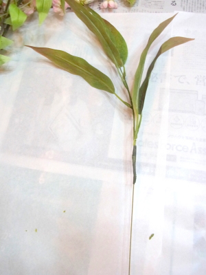 | 深みのあるユーカリの葉っぱの一枝に太いワイヤーを添え木します 重なり部分だけテーピングします。 | |