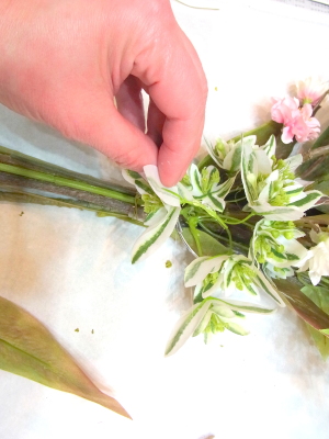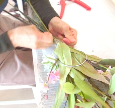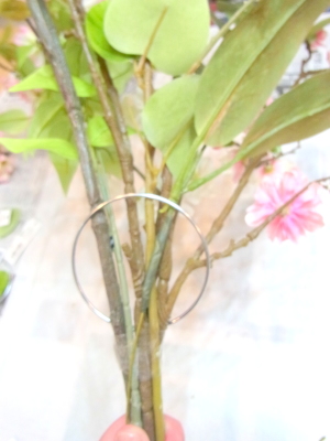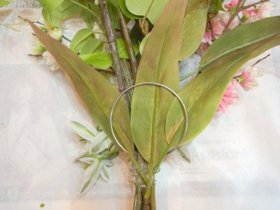 | 次に細葉ユーカリを除く、葉物も魔法のアシストリングの輪の中に刺して、高さをきめて、同様に、テープで止めていけきます。 リキュウソウはとても動きのある葉っぱなので レイアウトを 楽しんで入れてください ね。のびやかで素敵な花材です。 |