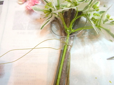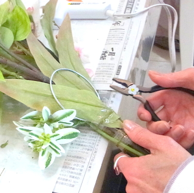 | 持ち手に固定したら、その上から茎全体に、仕上げのワイヤーをかけます このワイヤーが最終的な仕上げになりますのでもしお花を引っ張って動かしたい方は、その前に、調整を済ませておきましょう 花を高く入れたい方は、お花を引っ張るとじりじりと上がってきます 仕上げのワイヤー24番を写真のように二か所にかけましょう ポイント 何周もする必要はありません。2週ぐらいでオッケーですが、ペンチなどを使って際をしっかりねじることが大切です |