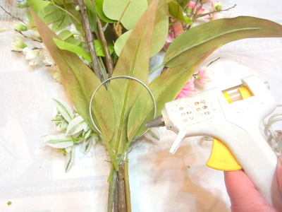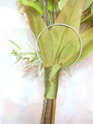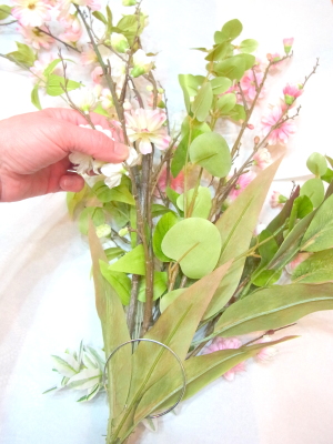| 先ほど、外してとっておいた細葉ユーカリ3枚を出しましょう アレンジを伏せて、写真のようにリングの裏側から葉をすべりこませて、貼り付けます。バック処理にもなります。 ポイント こうすることで裏面も綺麗ですし正面から見ても背景の色が入ります |