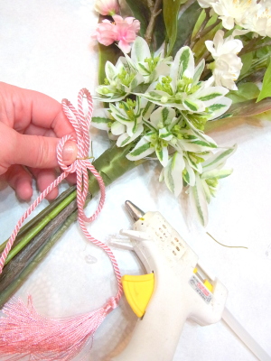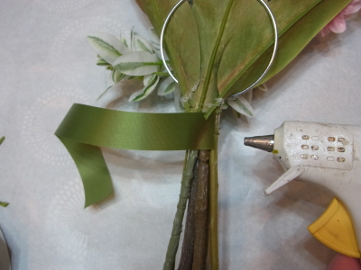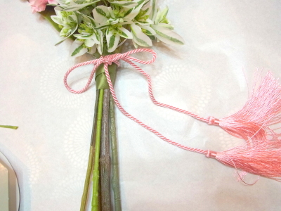 | お花が整ったら、持ち手にリボンを巻いてセロテープやワイヤーを隠します。 リボンは下から巻き上げると綺麗に巻けます ズルっと、落ちてくるときは一旦ねじってから巻き上げるとヒットします |