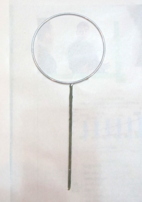 | 添木がふたつともできたら、 リングに挿してみましょう。持ち手にテープで固定します。 こちらは裏面の様子です |