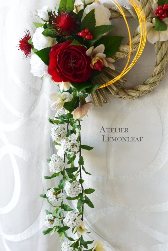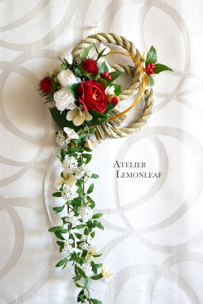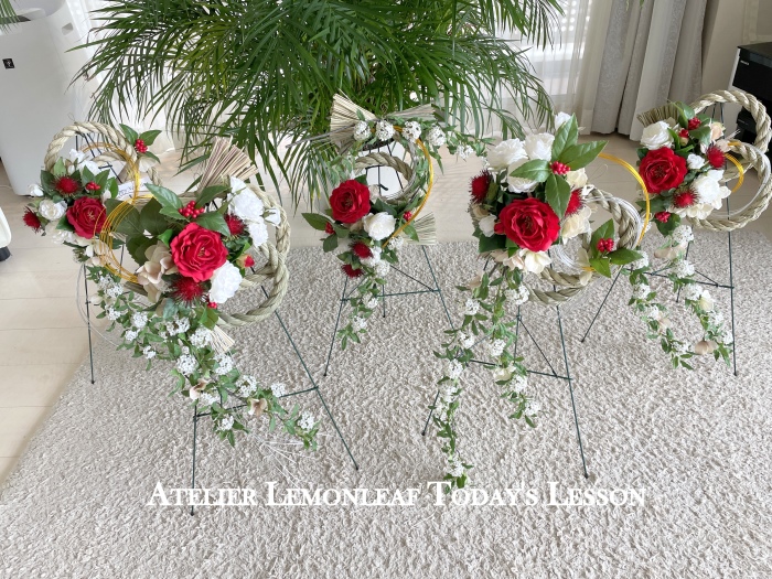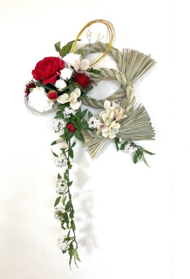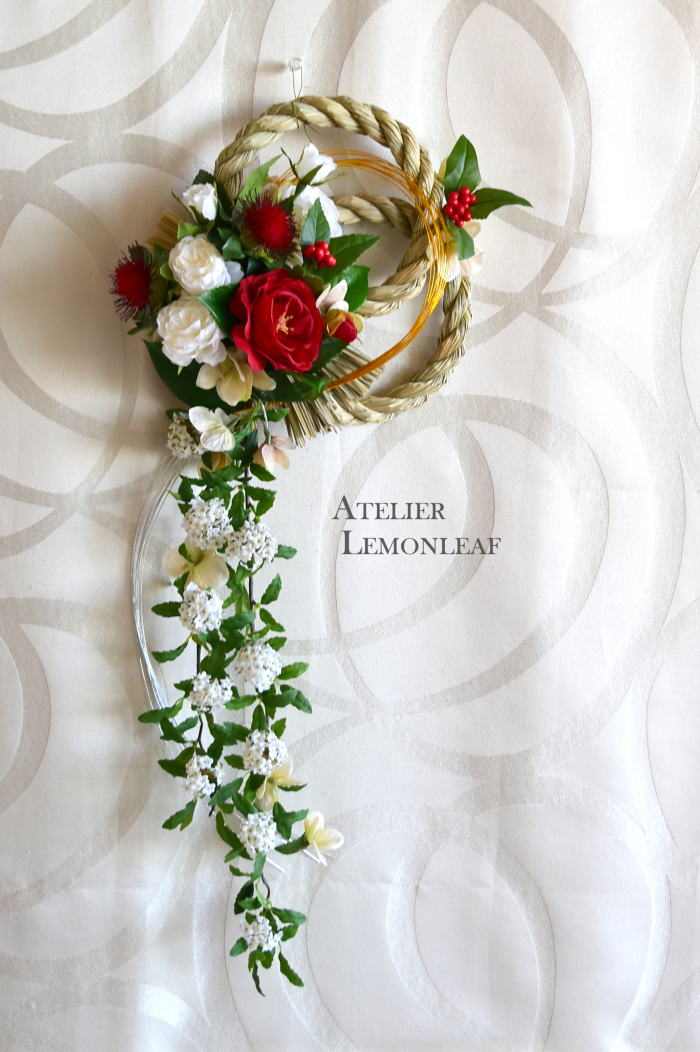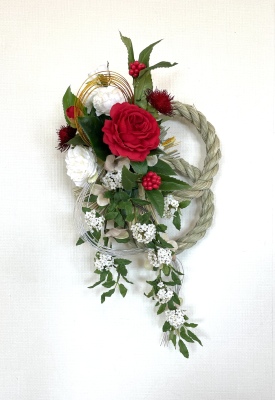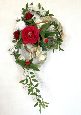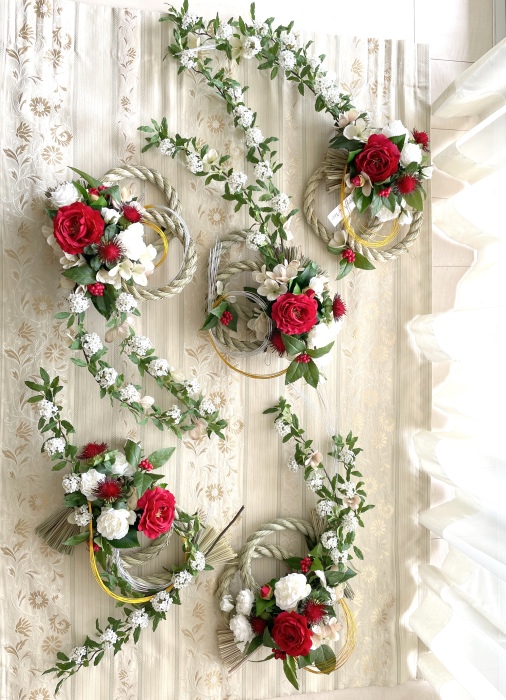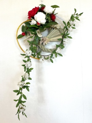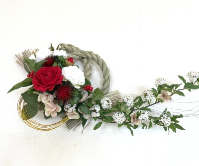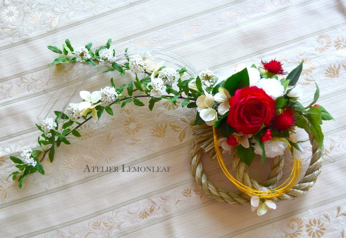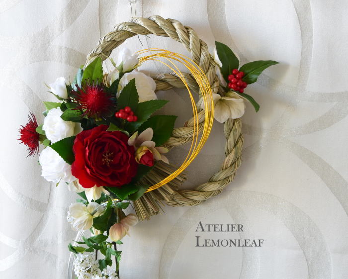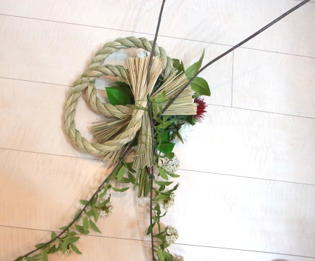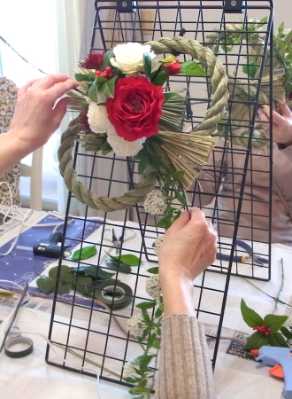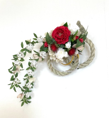 | 二つのしめ縄を好みの角度、好きなデザインになる様に、組んだり重ねたりして、ワイヤーをかけて固定します。 お手本は一例にすぎません。ぜひぜひ、自由に楽しんでくださいね!8の字にして、斜めにするのも可愛いです♪、 |