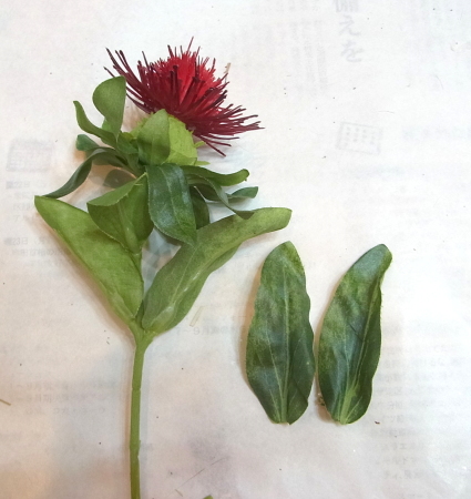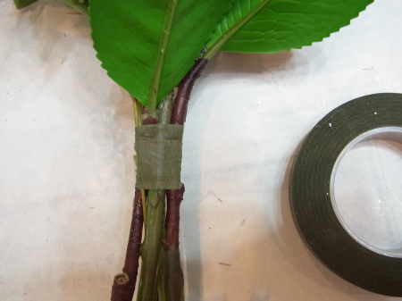 | これらを好きなレイアウトで花束にしてテープでまとめ、持ち手は8センチ程度に切り揃えます。 | |