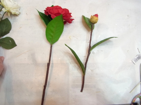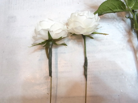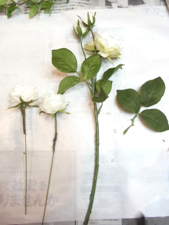 | バラは1~2輪小分けにして 1/2の太いワイヤーを添木してテーピングします。 | |