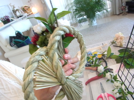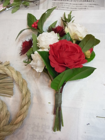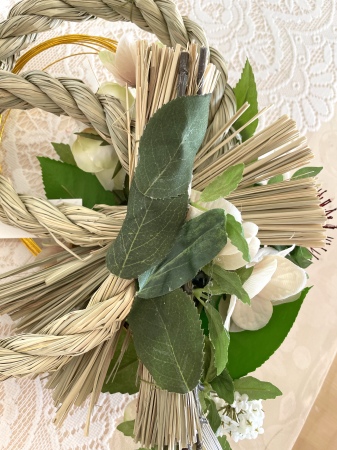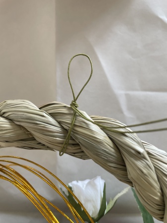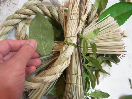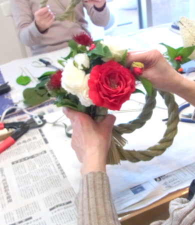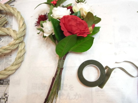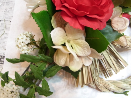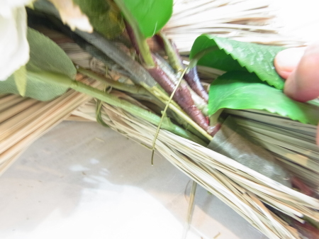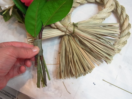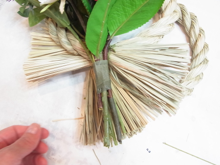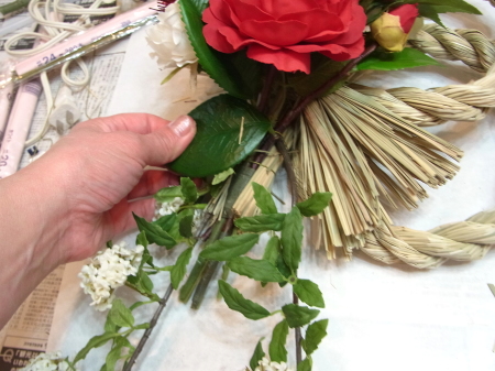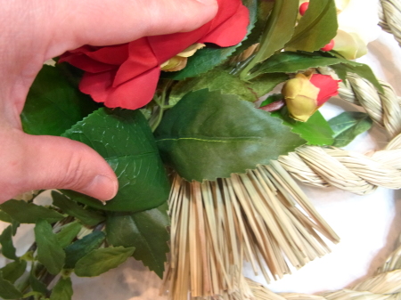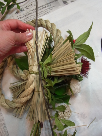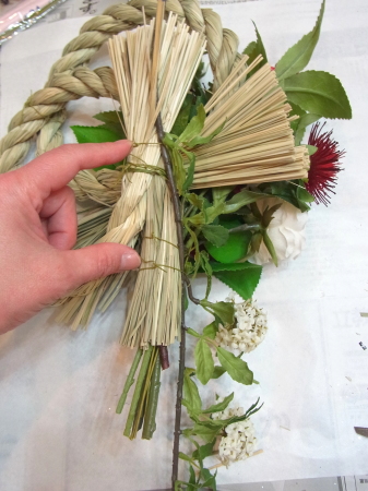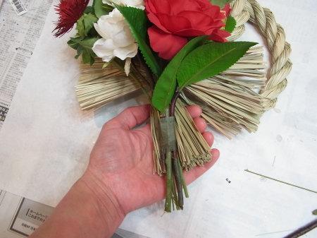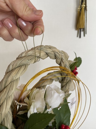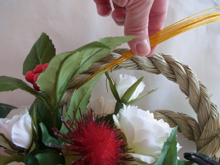 | 好きな位置で、花束をくくりつけます。 とめ方は、 持ち手の部分と、花の後ろの茎を少しすくって、しめ縄に固定します。 ワイヤーは二重するより、一重でいいので、しっかりと際をねじることほうが、固定の強度が上がります。 |