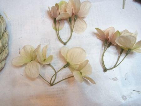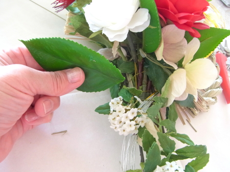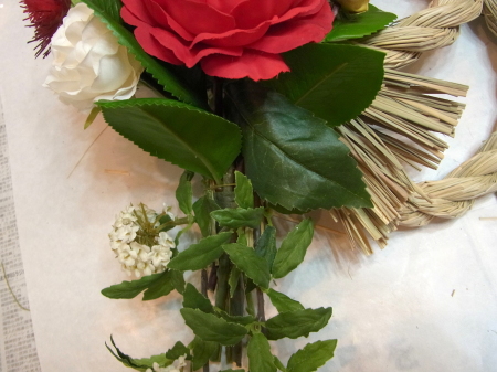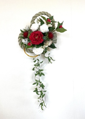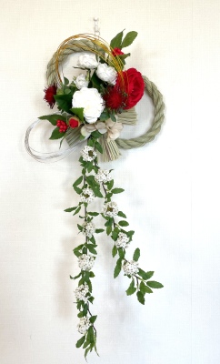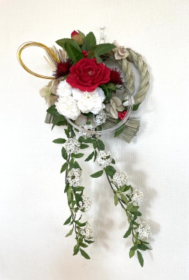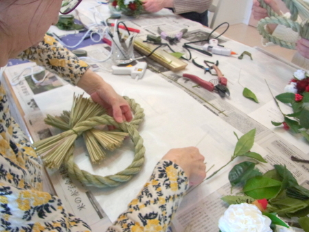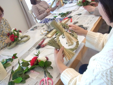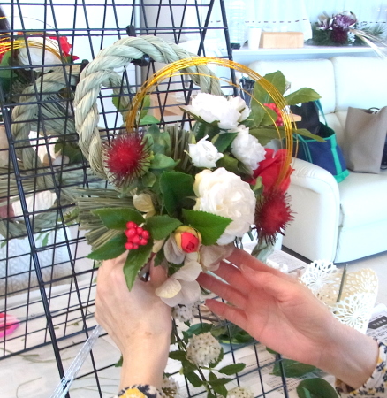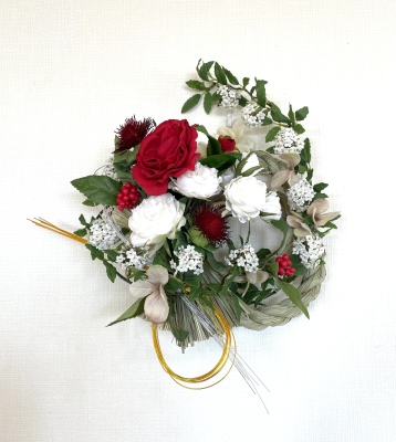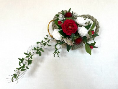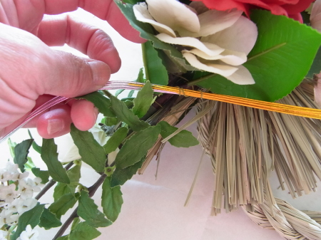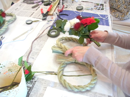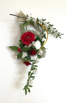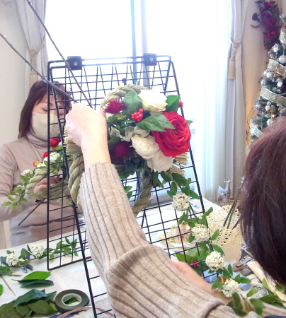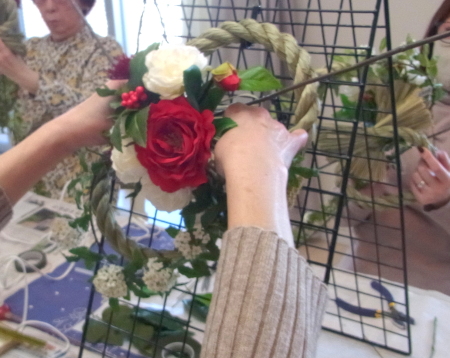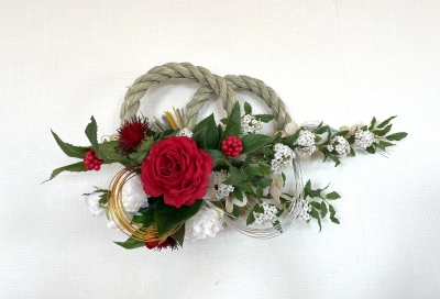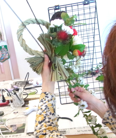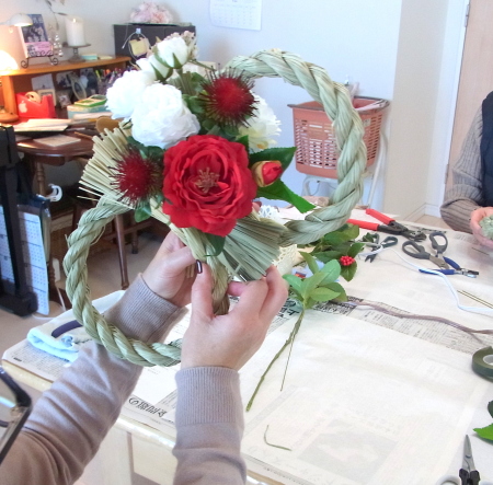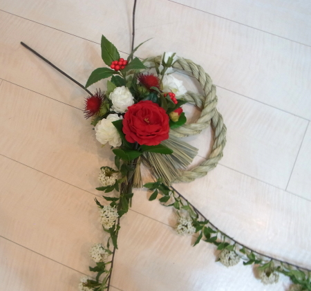 | 好きな位置で、花束をくくりつけます。 とめ方は、 持ち手の部分と、花の後ろの茎を少しすくって、しめ縄に固定します。 ワイヤーは二重するより、一重でいいので、しっかりと際をねじることほうが、固定の強度が上がります。 |
