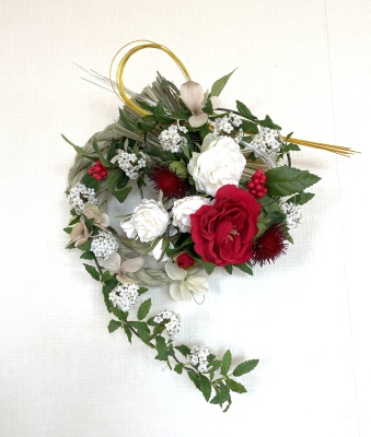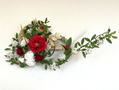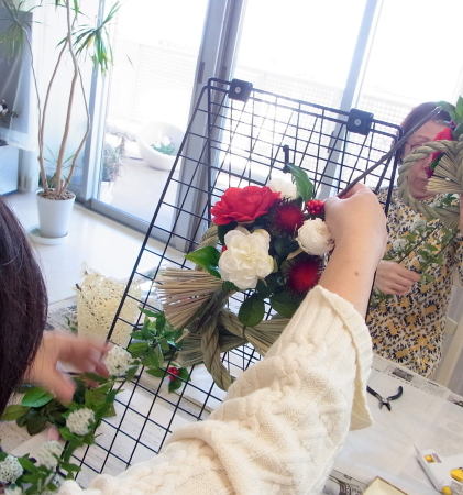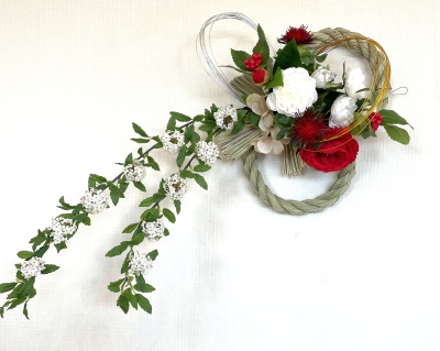 | 花束が固定されたら、コデマリをとめます。 いろいろ当てて、デザインを考えましょう。 コデマリの茎を、挿しこみ魅せたい位置にくるよう、裏側で茎を固定します。 コデマリはサンプルのように、長く使うだけでなく、円にしたり、しめ縄に絡めたり、いろいろな表情が楽しめます。ぜひ、トライしてみてくださいね! |
