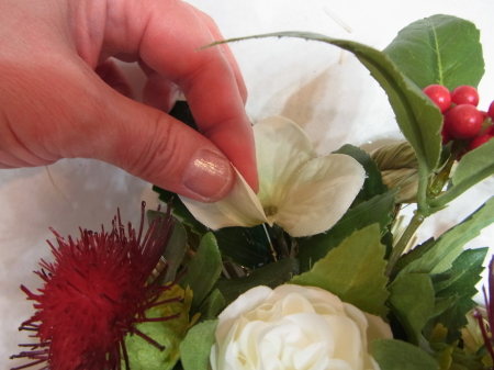 | 最初にとっておいた千両も好きな位置にトッピングします 脇からもチェックして、茎が見えている個所には葉や紫陽花を添えます。 |