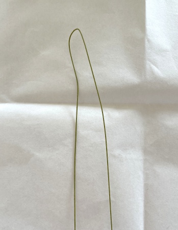 | フックをつくります。Uピンにして、その先端をくぐらせ、バランスをみてねじります。 フックの作り方はいろいろありますが、これが一番簡単で、先端がまるくて、綺麗にできます。 |