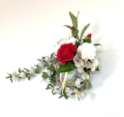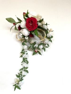 | ワイヤーがみているところを、ツバキの葉や紫陽花でかくします。 紫陽花だけが唯一、グラデ―ションのある花材です。紅白のメリハリに、すこし優しいイメージが加わります。 紫陽花は長短つくり、凹凸につけると自然で美しく見えます。コデマリにとばしても可愛いです。 |