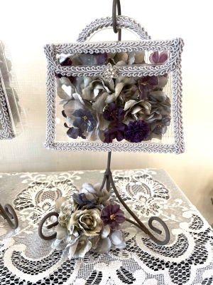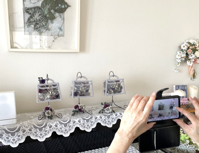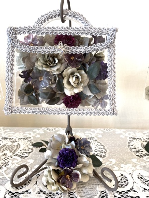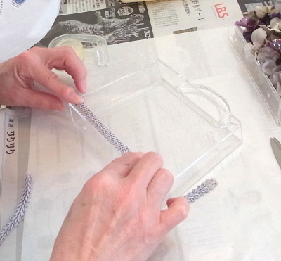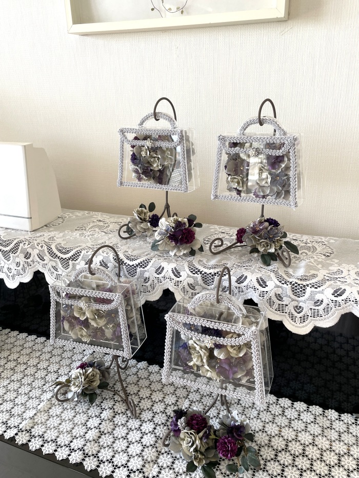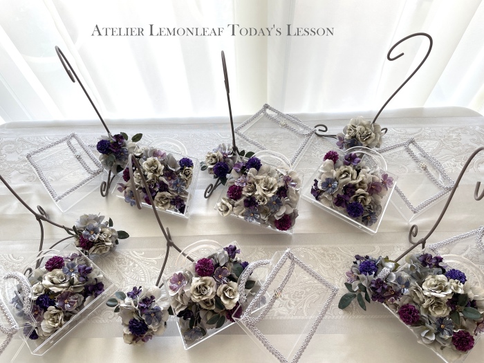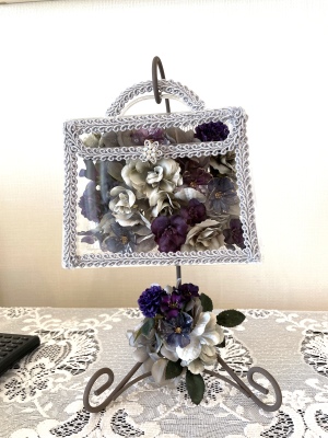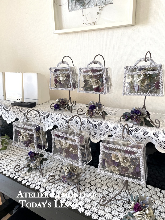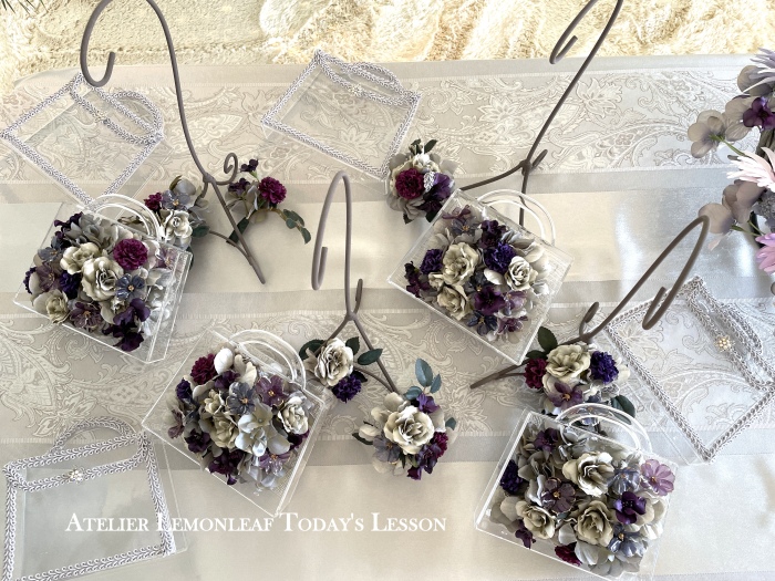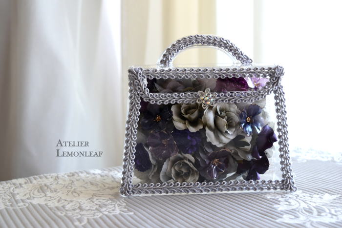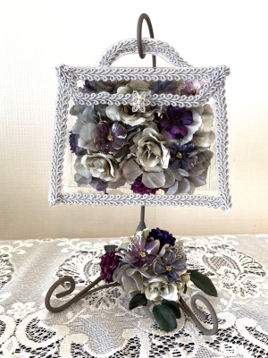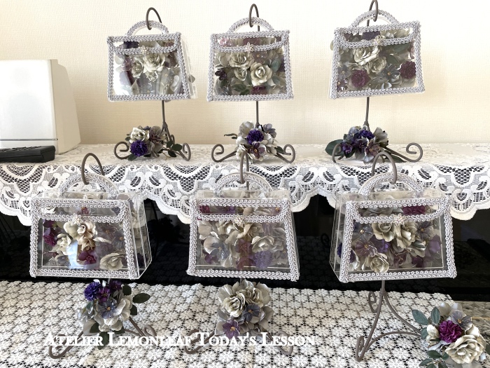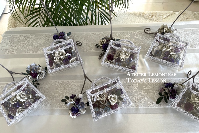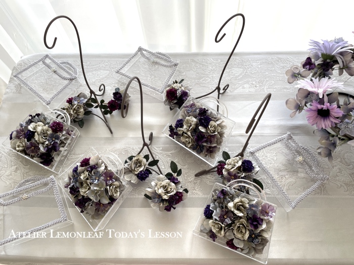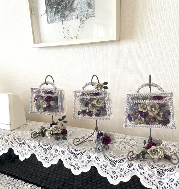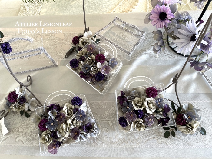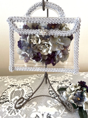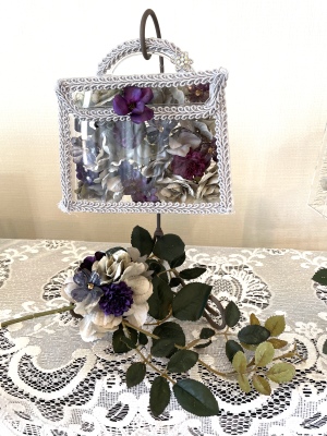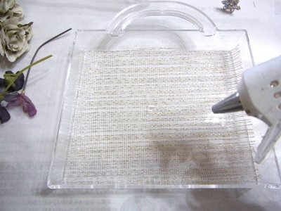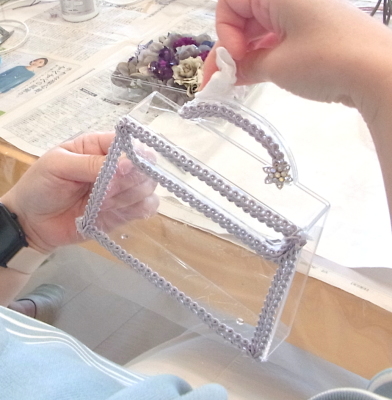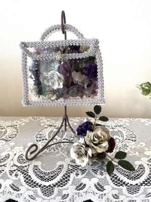 | こんにちは 今月はペット素材のお花を使ったアレンジです。思い思いいレイアウトを楽しんでくださいね! それでは早速はじめましょう。 布をバックの背面の大きさにカットします。 注意 プラスチックのバックは前と後ろがあります。 後ろのケースの底に布をぐルーではります。 この時のグルーは広範囲にせず、四隅と中心くらいでOKです。手で押すと熱いのでサミの先端などでおすと付きます。 裏からみてもできるだけ綺麗に見えるように仕上げましょう。 |