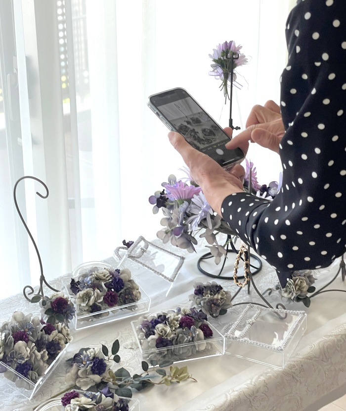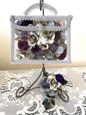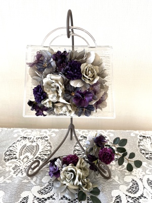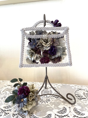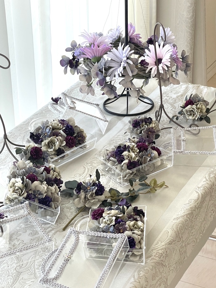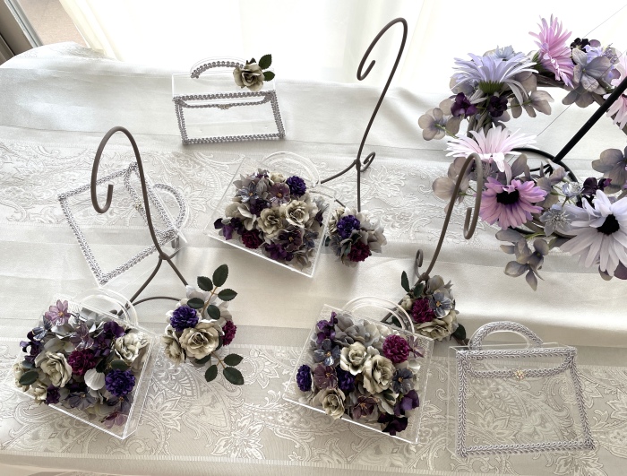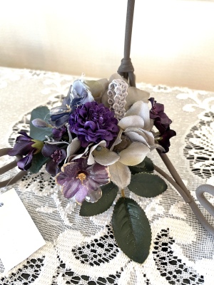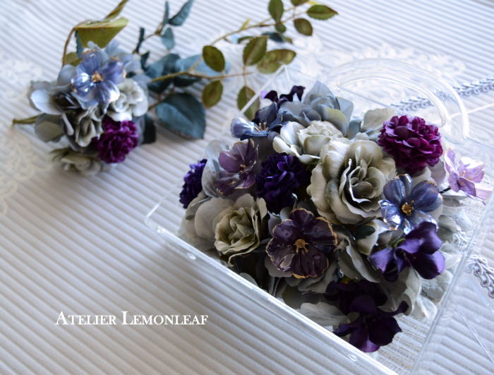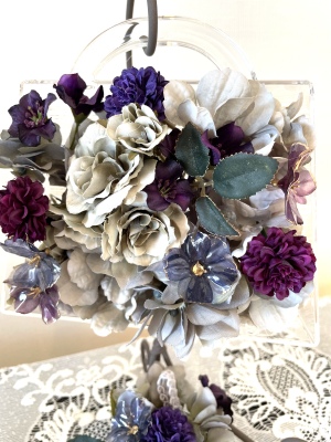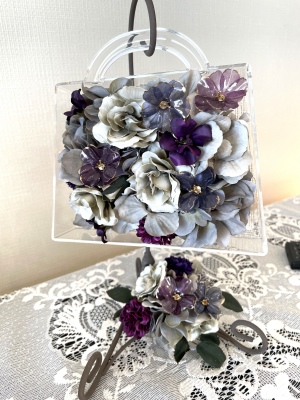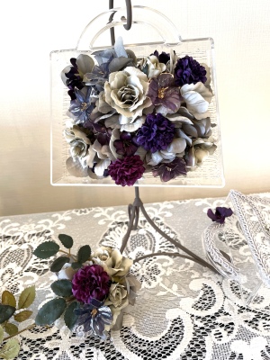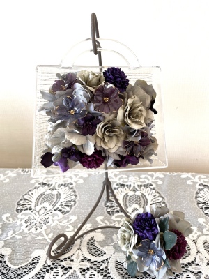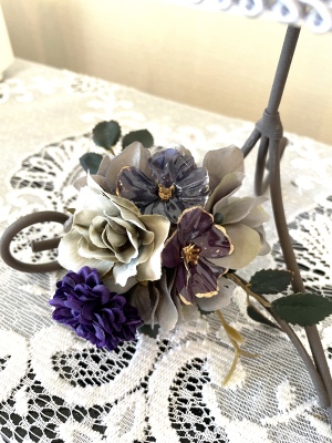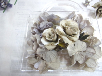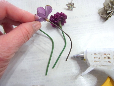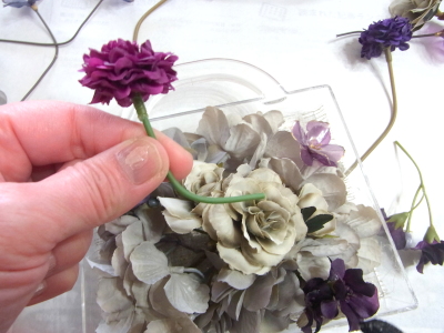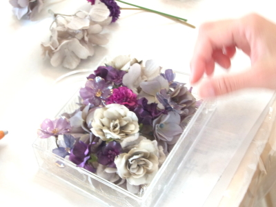 | マム、ペッとフラワーなど残りのお花を好きな位置にいれます。L地にすることでよくつきます。 様子を見て、長い場合は、無理矢理押し込こまずに、適量にカットしてから、グルーでつけてください。 紫の小花は小さくして挿しこむというよりは、載せて留める程度です。 お花は全部つかいきらなくてOKです。残ったお花でコサージュを作ります。 |