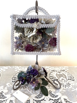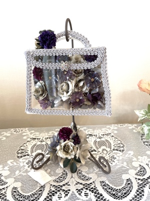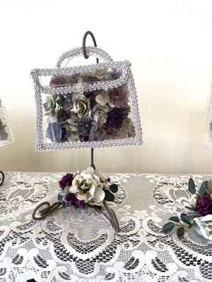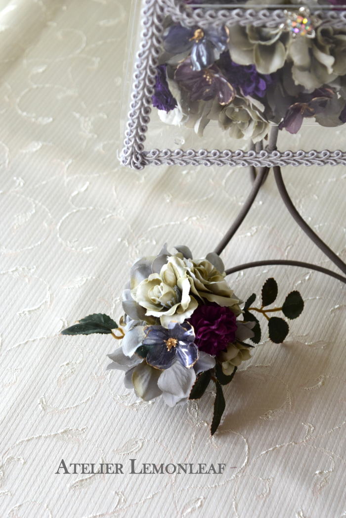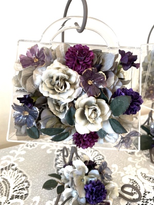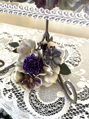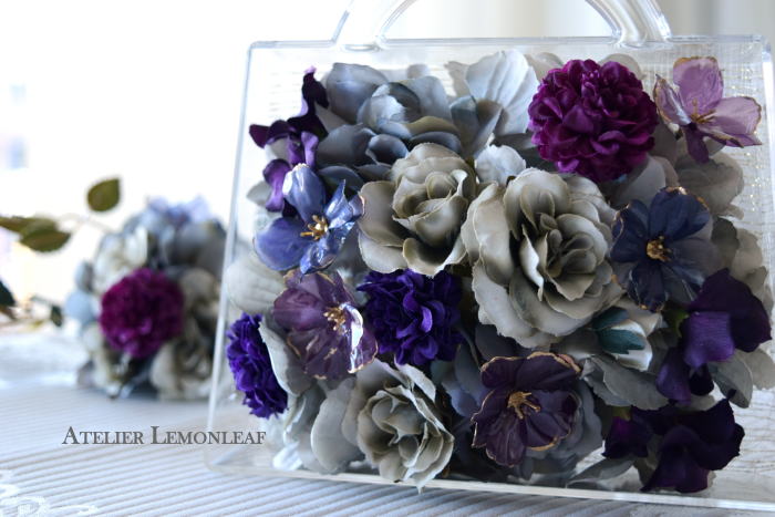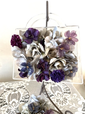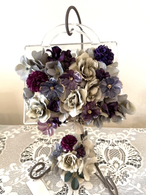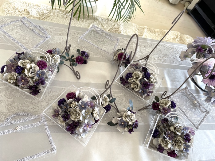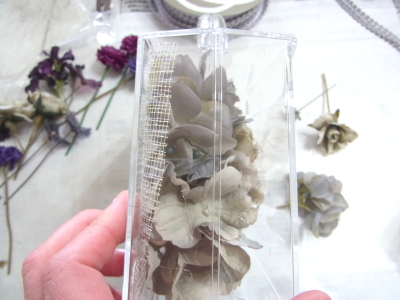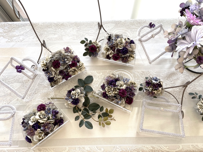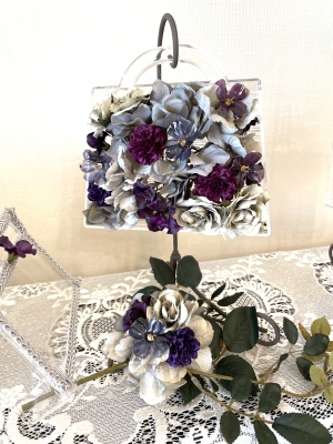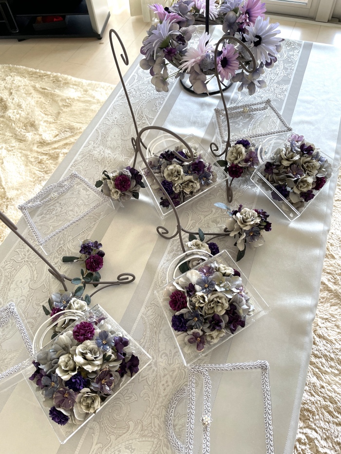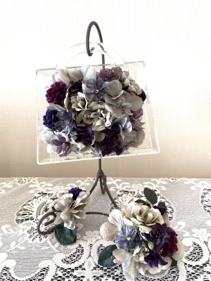 | マム、ペッとフラワーなど残りのお花を好きな位置にいれます。L地にすることでよくつきます。 様子を見て、長い場合は、無理矢理押し込こまずに、適量にカットしてから、グルーでつけてください。 紫の小花は小さくして挿しこむというよりは、載せて留める程度です。 お花は全部つかいきらなくてOKです。残ったお花でコサージュを作ります。 |