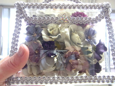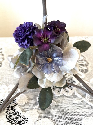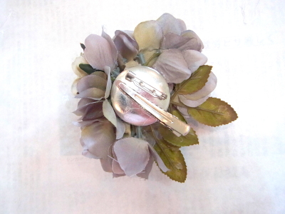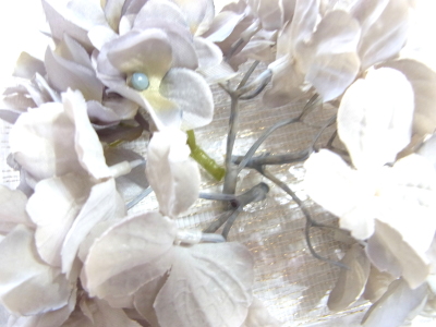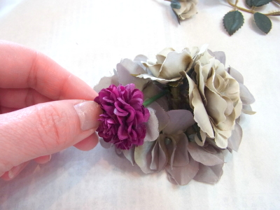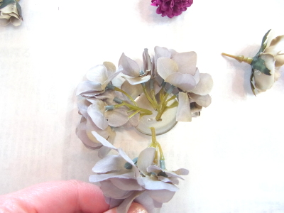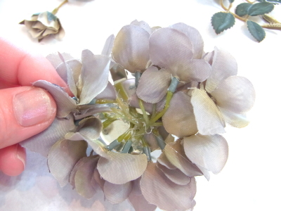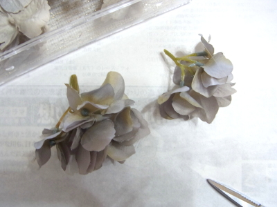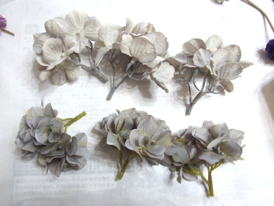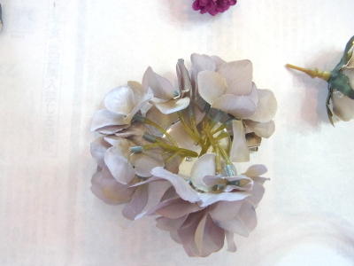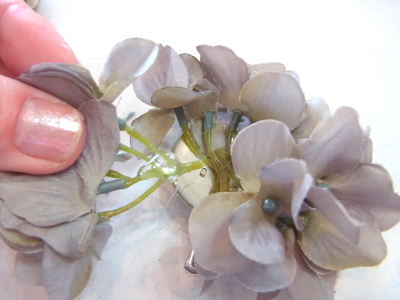 | 残ったあじさい一房を三つにわけて、土台にとめます。(最初に選んだ紫陽花によって残っているものが、ちがいますので、濃い色か薄い色か、どちらの紫陽花でもOKです) これもバックの時とおなじように、中心に茎をむけてこんもり高くつけます。 |