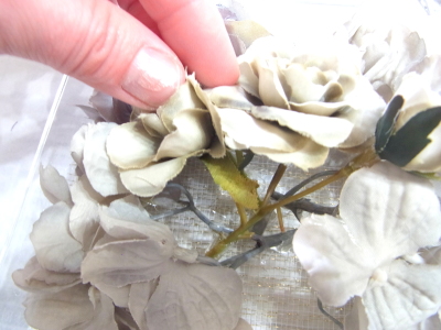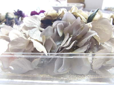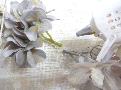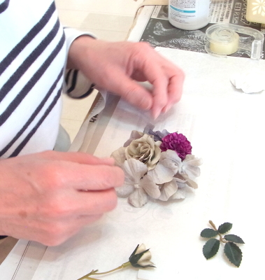 | ここからすべてグルーでつけていきます。 紫陽花を好きな色で4房選び、中央に茎をむけてとめます。 四隅にいれるのではなく、中央によせます。 この紫陽花がベース(背景)になり、ここから好きなお花をレイアウトしていきます。 ふんわり小高く付けましょう。 |