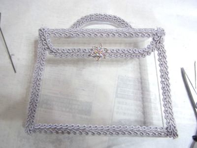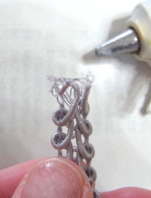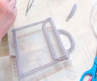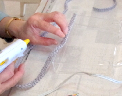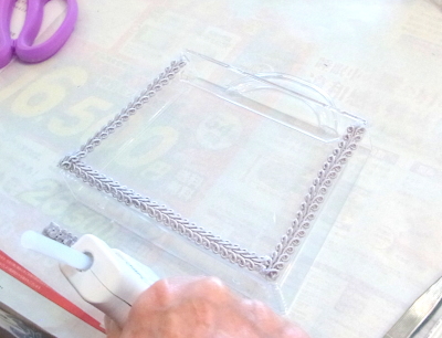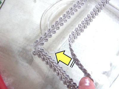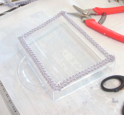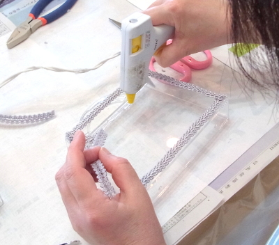 | 表の蓋に、写真のようにリボンをグルーではっていきます。 注意 このとき グルーが表面に垂れないように注意しましょう。もし、ついてしまったら、こすらないで乾いてからそっと取りましょう。 |