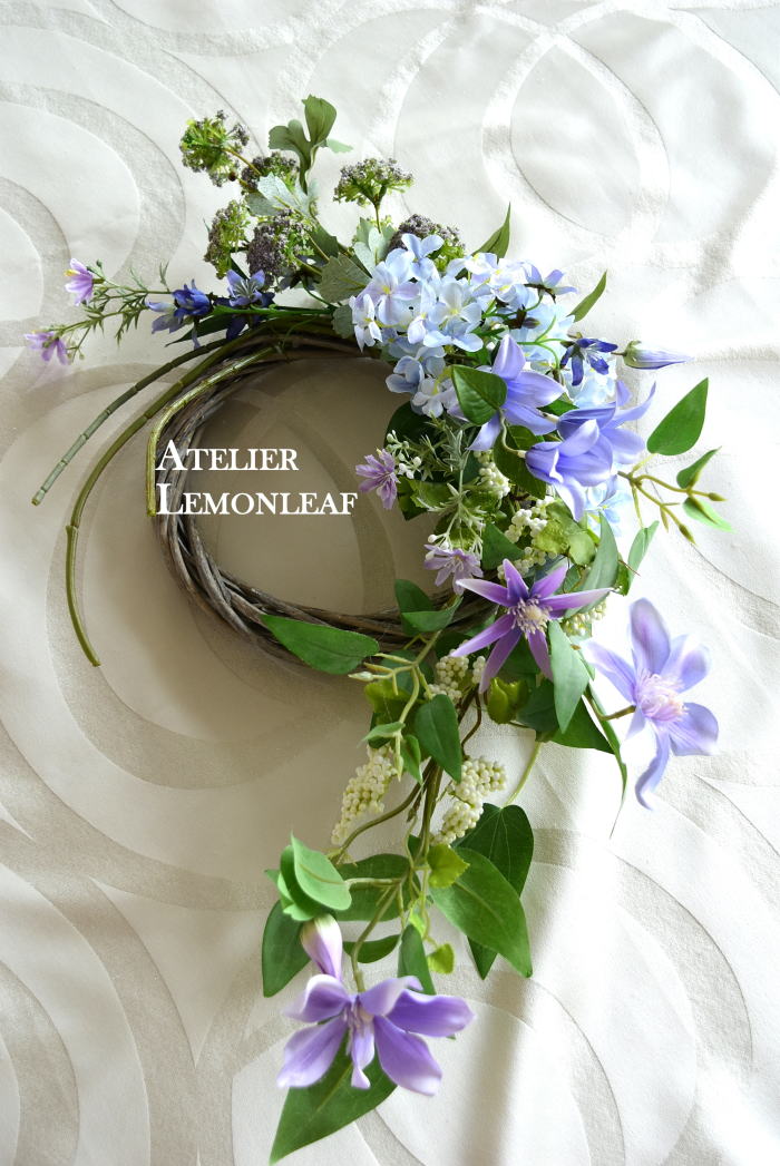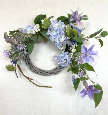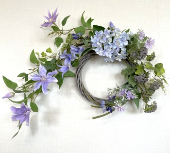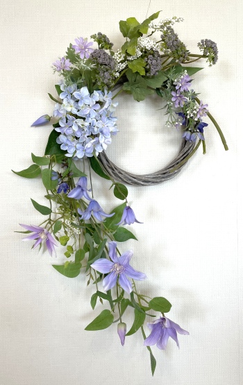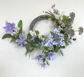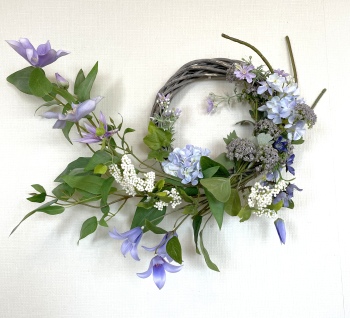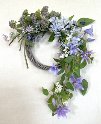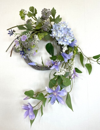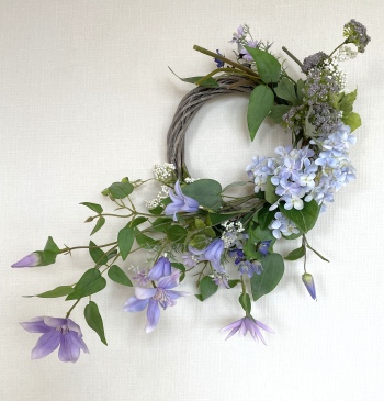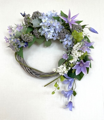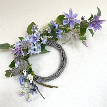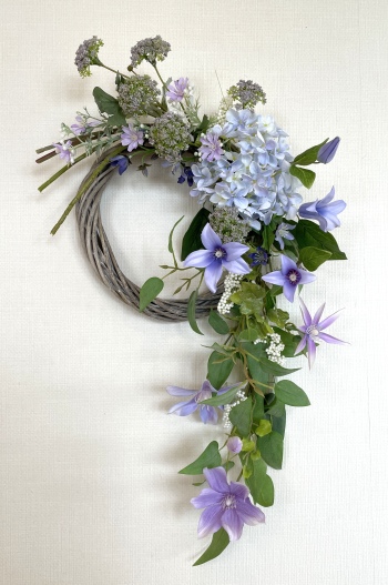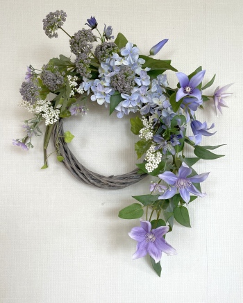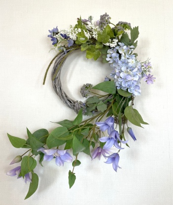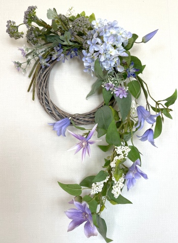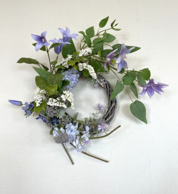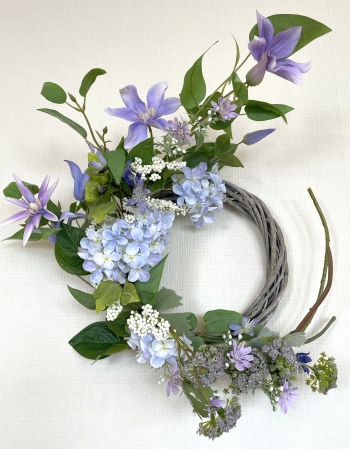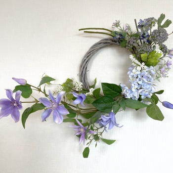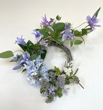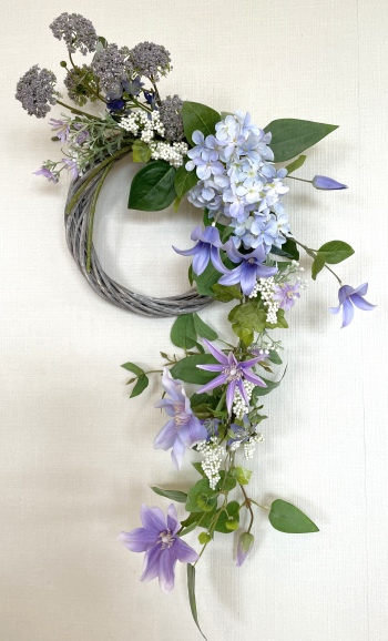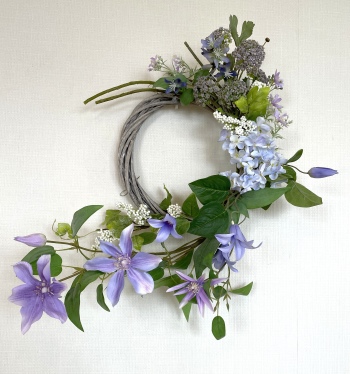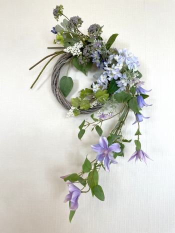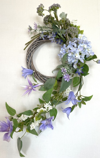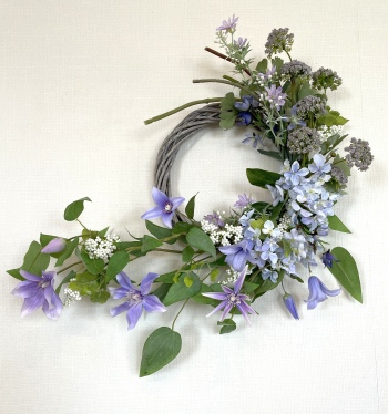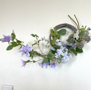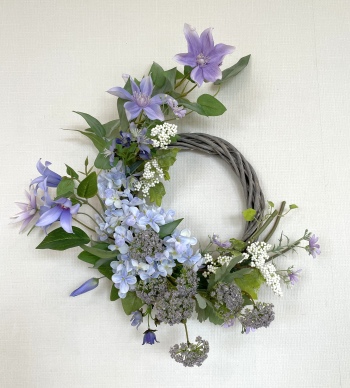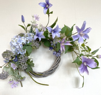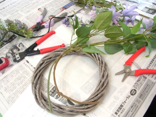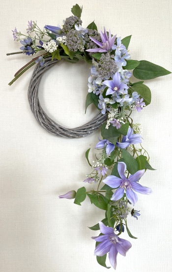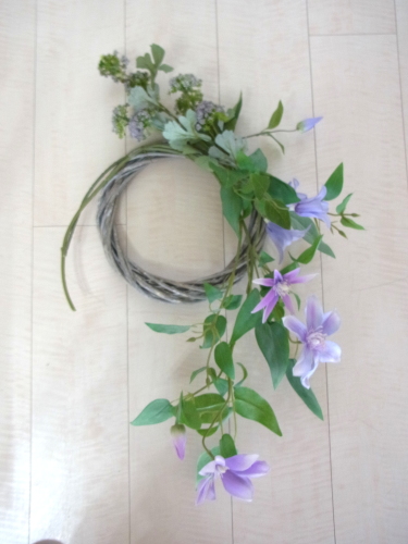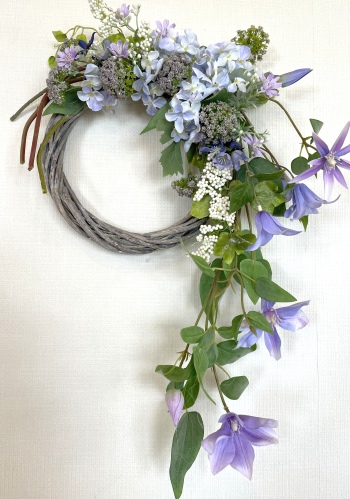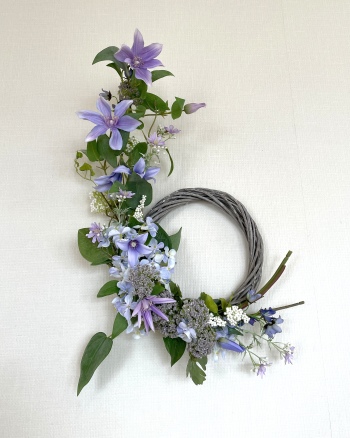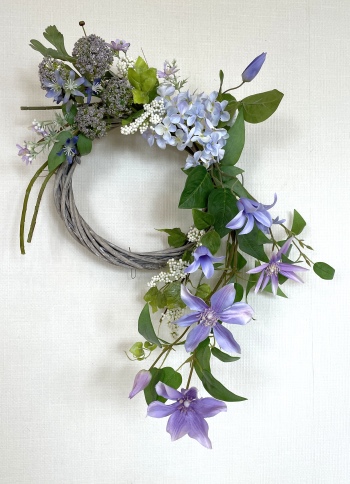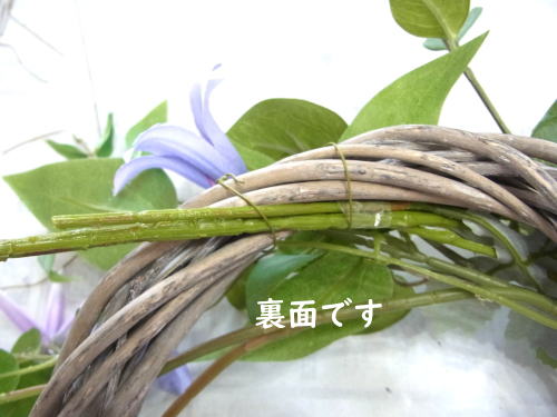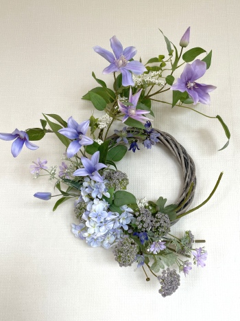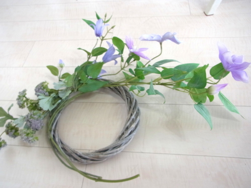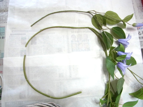 | こんにちは、今回はクレマチスのリースです。とってもさわやかな色合いが魅力です。クレマチスの表情を楽しんでくださいね! では早速、スタートしましょう 作り方も、サンプルは一例にすぎませんので、いろいろなスタイルにチャレンジしてみてくださいね! まず長いほうのクレマチスの茎を半分くらいにカットします。 |