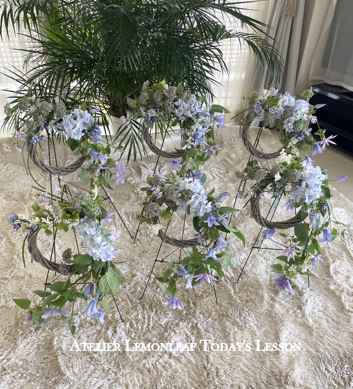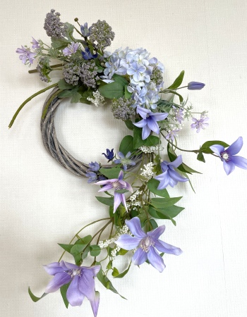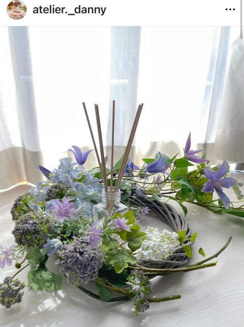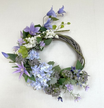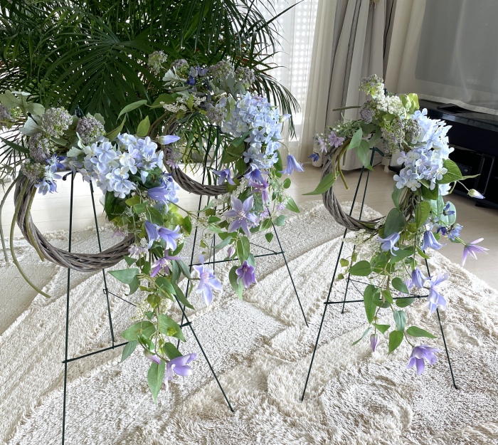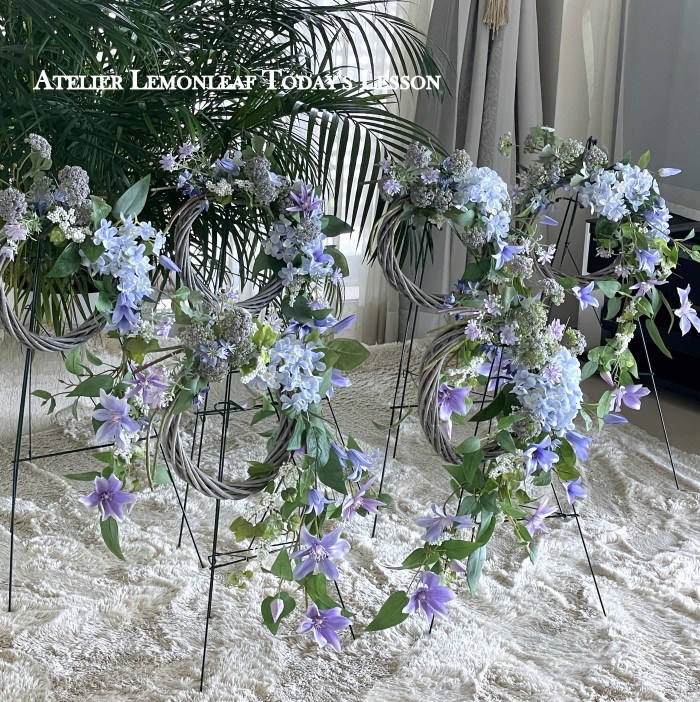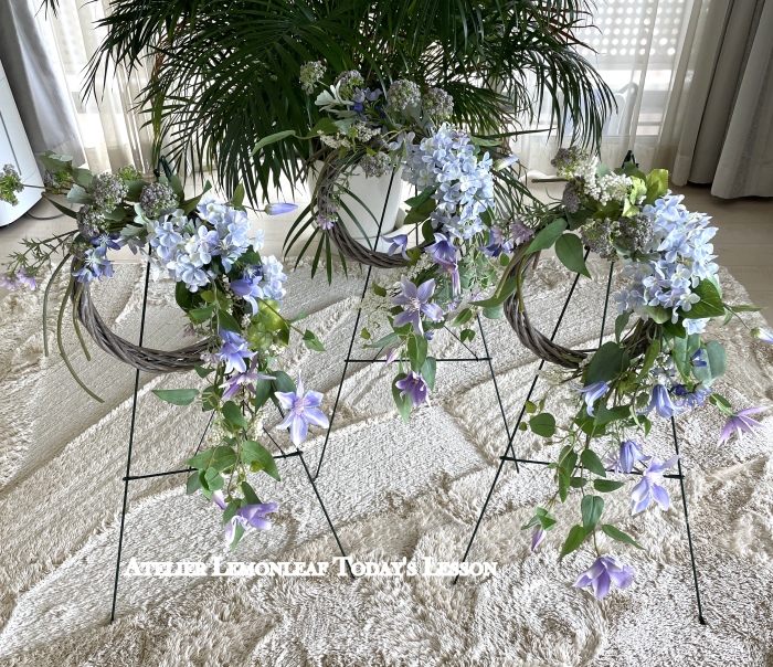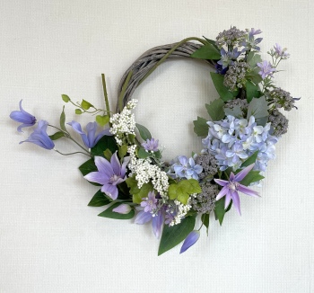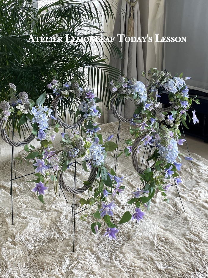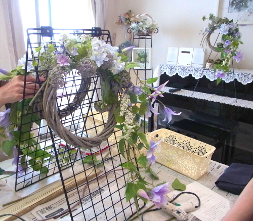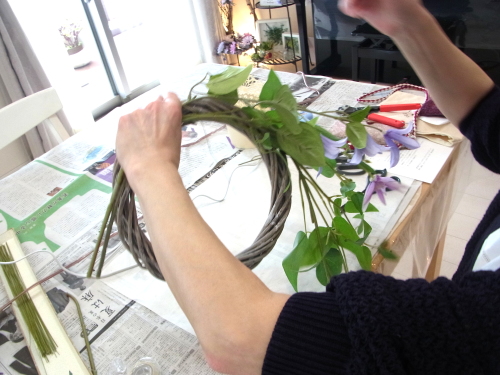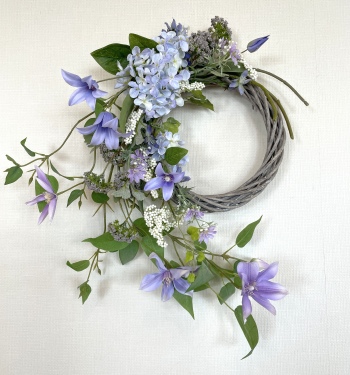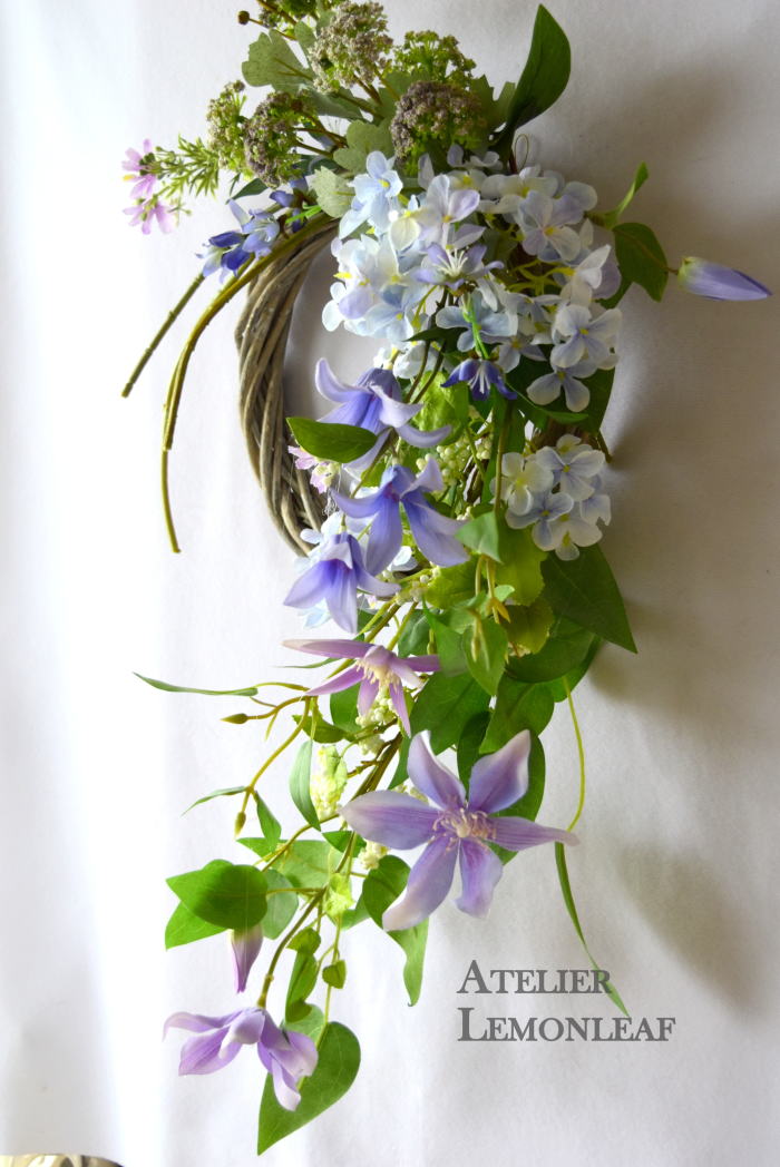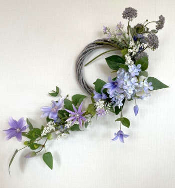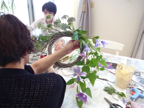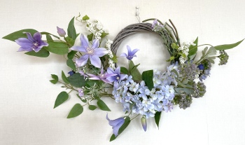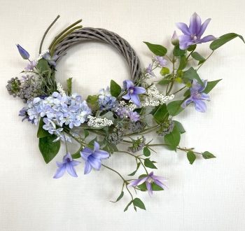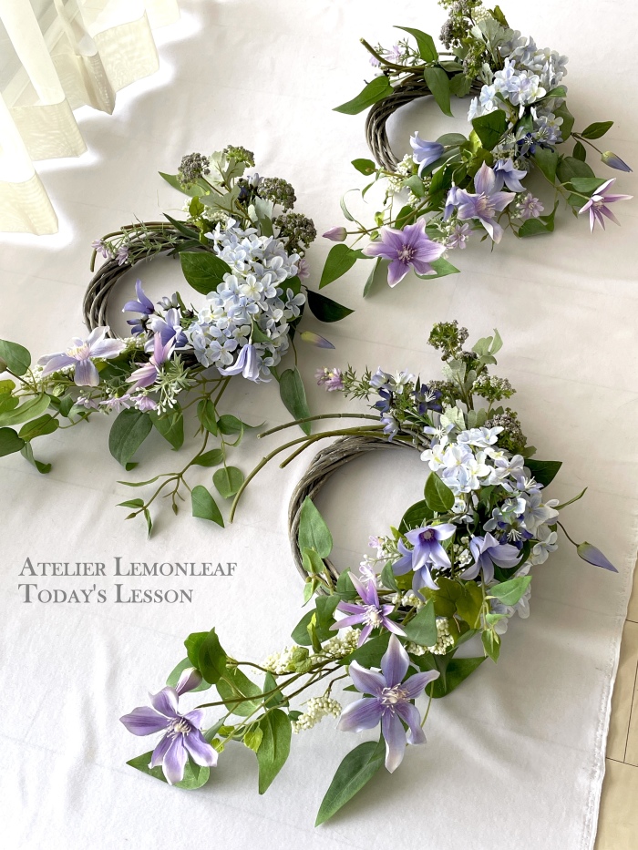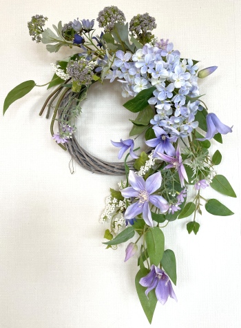 | こんにちは、今回はクレマチスのリースです。とってもさわやかな色合いが魅力です。クレマチスの表情を楽しんでくださいね! では早速、スタートしましょう 作り方も、サンプルは一例にすぎませんので、いろいろなスタイルにチャレンジしてみてくださいね! まず長いほうのクレマチスの茎を半分くらいにカットします。 |