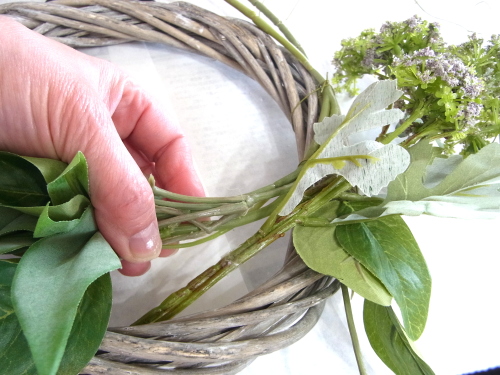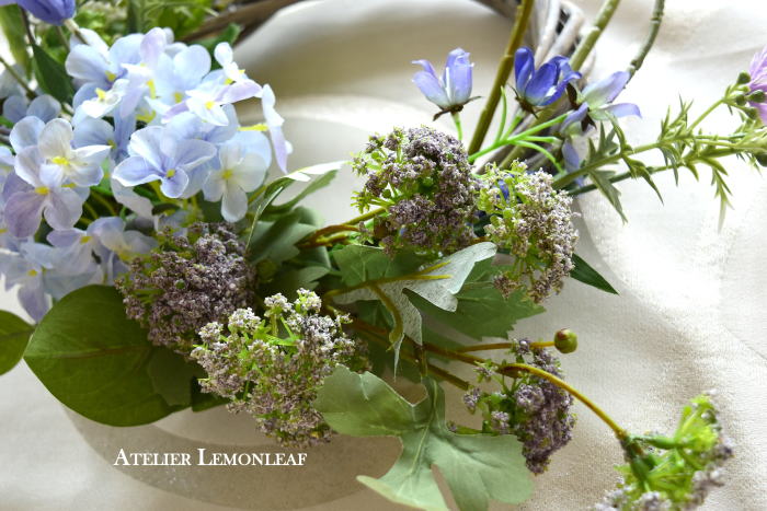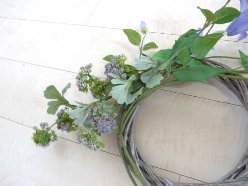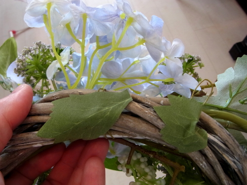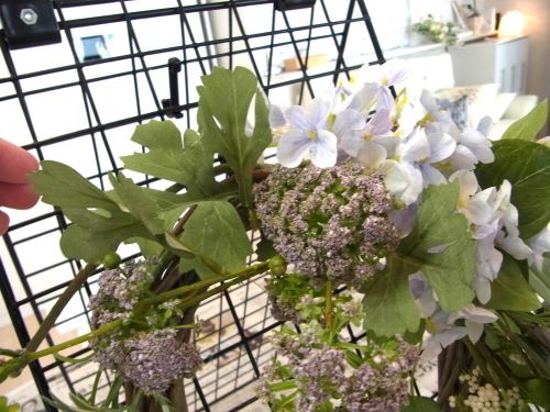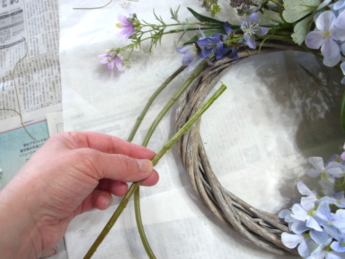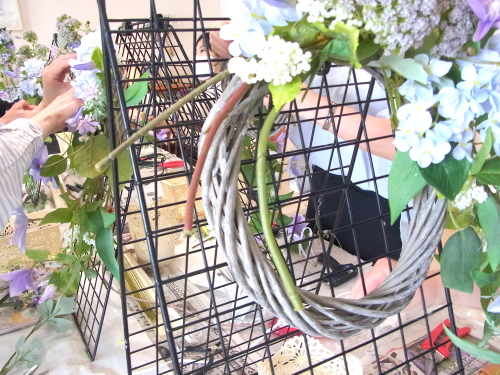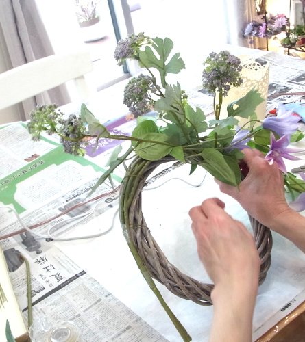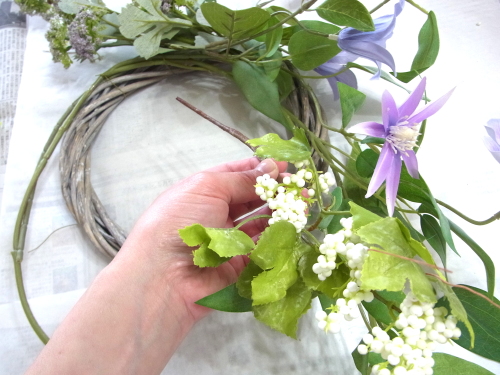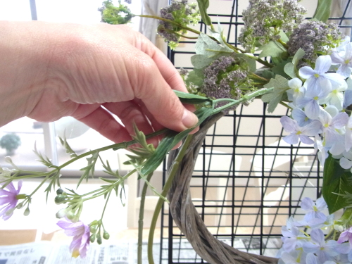 | 紫陽花の先を斜めにカットすると溝に入りやすいです 紫陽花をグルーでアレンジの中央につけて、シルエットを整えます 紫陽花の魅力はふんわり感、ぎゅー詰めになるくらいなら、間引いて、別の場所に使いましょう。 リースの両サイドもチェックしてね!紫陽花があると自然です。内側の円につけるのもおしゃれです。 |